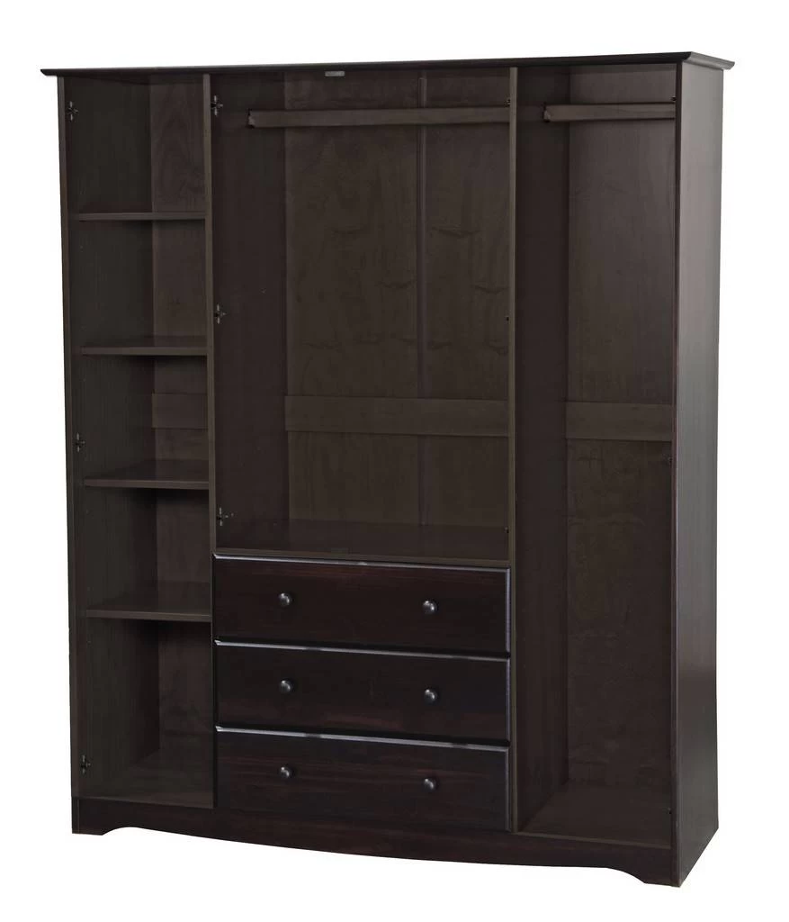 Does your home have few or no closets? Are you lacking space for your abundant wardrobe? Let this very large, solid wood, Family Wardrobe come to your rescue! It’s cleverly designed to satisfy many needs and not waste money on unnecessary parts. That’s why it is sold with no shelves and 3 rods should you only need to hang your garments. If plenty of shelving is something you’ve been searching for, look no further! You can have a mix up to 3 large and 8 small shelves in this one unit! And of course, there are always the 3 drawers for you to store even more items. Save yourself from clothes clutter and lack of storage. Get your Family Wardrobe today!