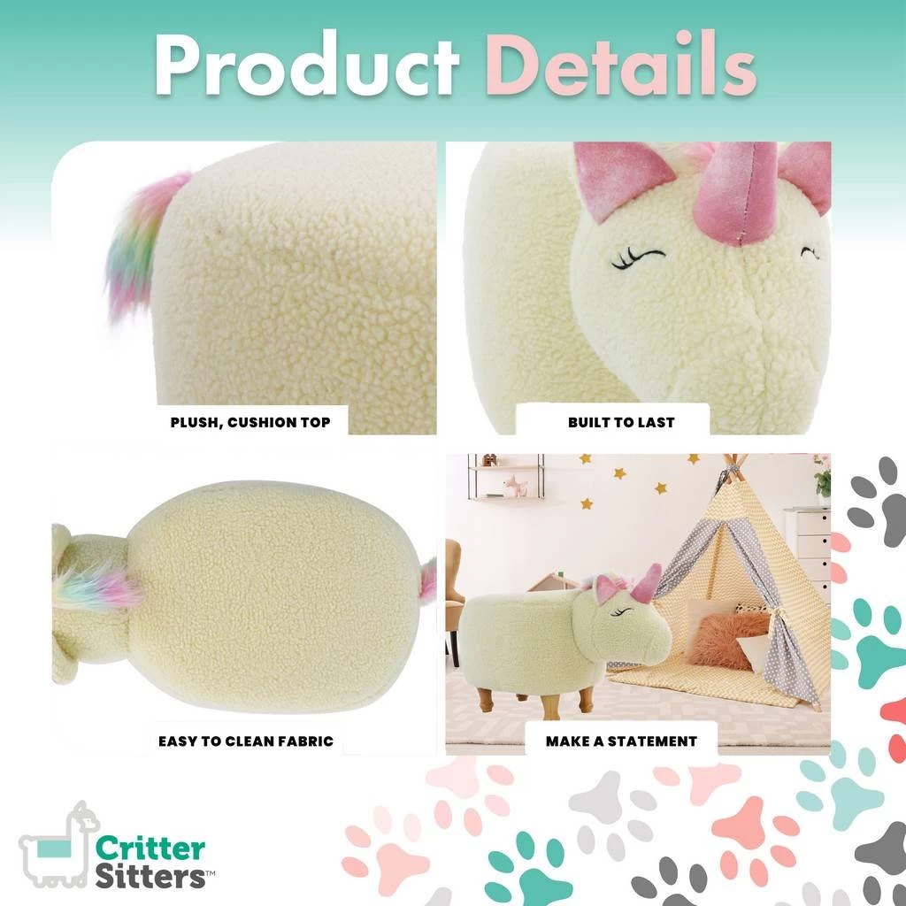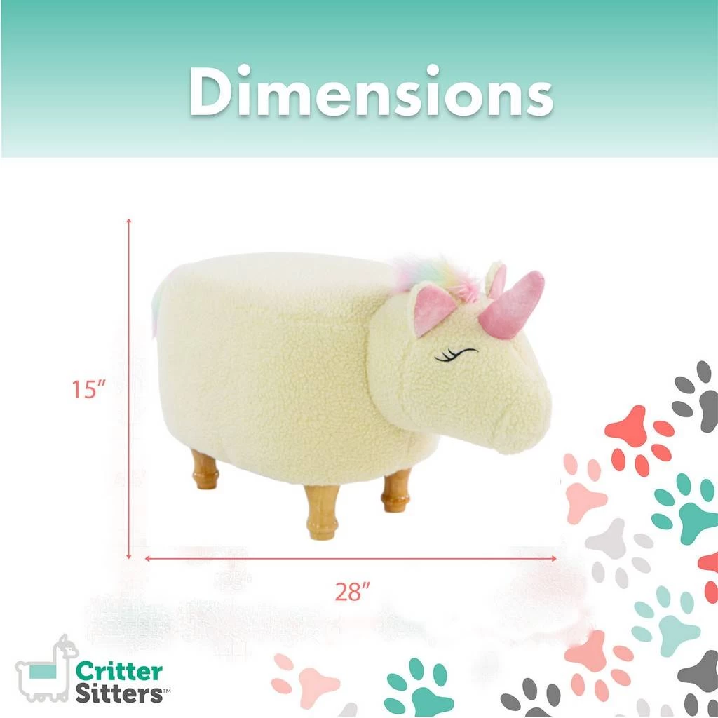 Create a fun and adorable sitting zoo with Critter Sitters! Designed for kids and adults alike, our sturdy animal-shaped ottomans are both stylish and multi-functional. They offer a comfortable seat close to the floor without actually sitting on the floor. Four strong, sturdy legs keep this footstool stable and safe. Plus, the high-quality fabric, thick padding, and durable stitching offer you a comfy place to rest your feet. Pair with your favorite chair in any room! This playful hassock works well as a functional accent in a ‘s nursery, toddler’s bedroom, or children’s playroom. This unique stool also makes a great conversation piece in any area you want to add a little decoration. We have a large variety of cute critters to choose from so each member of your family can have their own special friend to love.