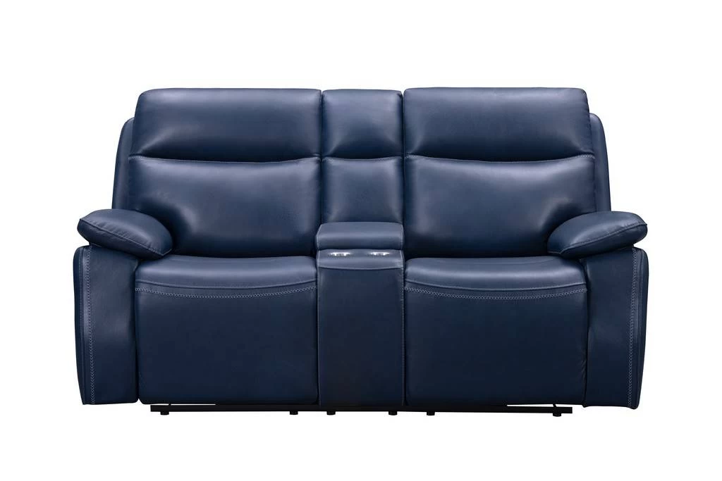 Relaxed contemporary power reclining loveseat console with power head rests, split pub back design, pocketed coil bucket seating, and foam pillow arms. The back, seat fronts, and arms are accented with decorative stitching. Power controller has a USB port.