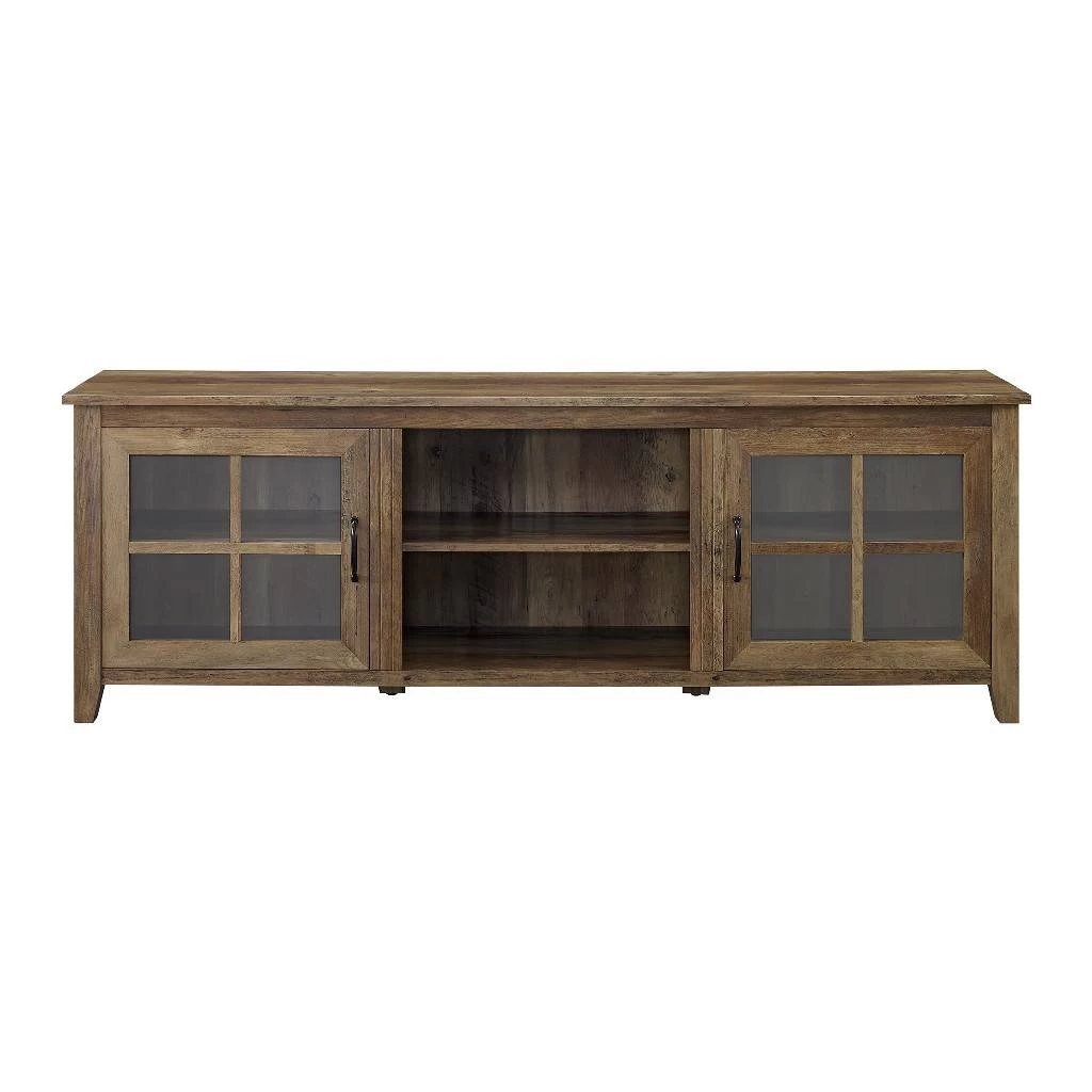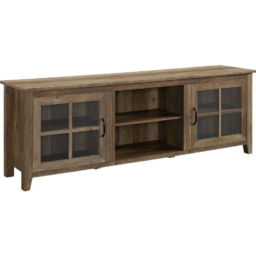 Showcasing window pane cabinet doors, this 70-inch TV stand has a stylish farmhouse appeal. With a high-grade MDF, durable laminate, tempered safety glass, and metal construction for a solid and sturdy design for storing your media, electronics, and more. Display décor or your book collection behind the glass pane doors with your electronics on the center open shelving. Including cord management and adjustable shelving for an easy fit for all of your items. This transitional and traditional entertainment center can hold up to a 78-inch TV for your or be used as a storage console in your for extra blankets, pillows, jackets, and shoes.