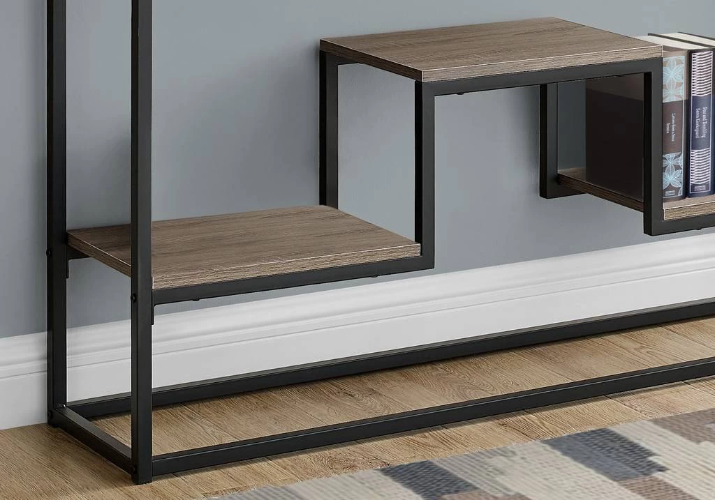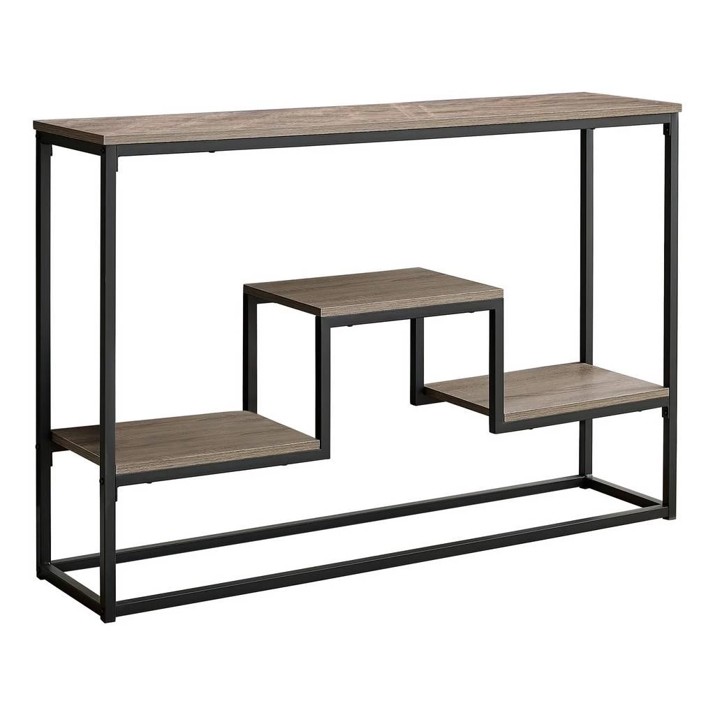 This entryway console table makes it that much easier to show off your books / plants / photos and other items. A warm welcome as an entryway table / this piece can also be placed in the living room or bedroom. It features a charming multi-level shelving style with taupe wood look table tops. This accent table makes your small home / apartment or condo look carefully organized and modern. The black metal frame provides extra style.
