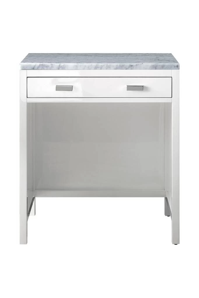 The Addison Collection 30-in. Free-standing Countertop Unit by James Martin Vanities comes in a glossy white finish on parawood with a marble top giving you a fresh take on Shaker-inspired design with a look of luxury. Handcrafted and gender-neutral, it fits effortlessly into modern or transitional rooms. This vanity countertop keeps your things neat and tidy thanks to its large drawer and generous vanity top that will easily hold a laptop, home or toiletries. Adding a cool contrast to the rich wood with burnished nickel hardware, the 3-cm Carrara marble vanity top displays a crisp white background with delicate grey veining, giving this piece a lustrous glow that you will not find with any other top.