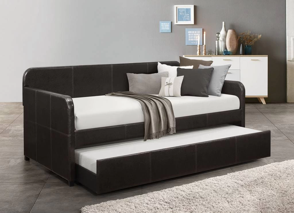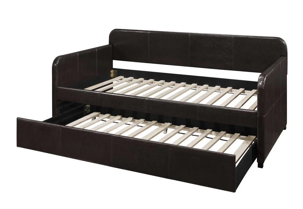 Clean style & comfort to your or guestroom with this daybed. The daybed has a sturdy wood and manufactured wood frame with a straight back and track arms with rounded corners and a pull-out trundle. The pull-out trundle offers extra sleeping space when you have extra guests.