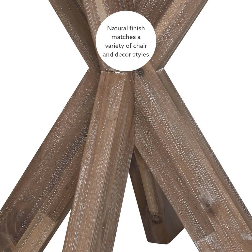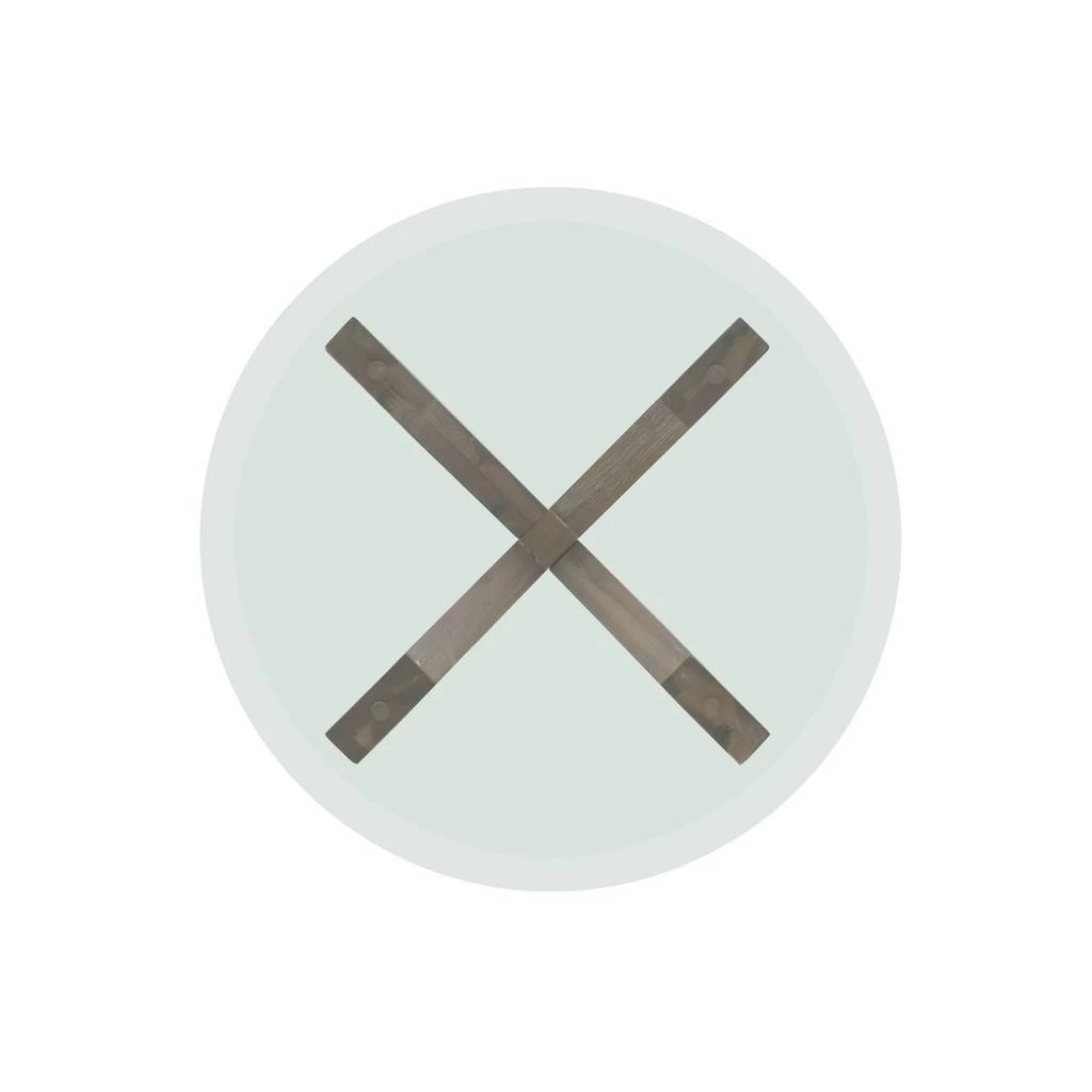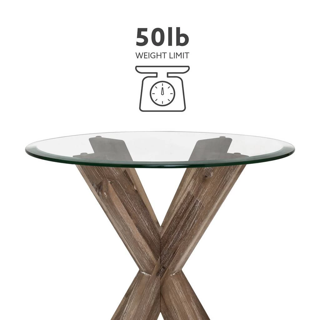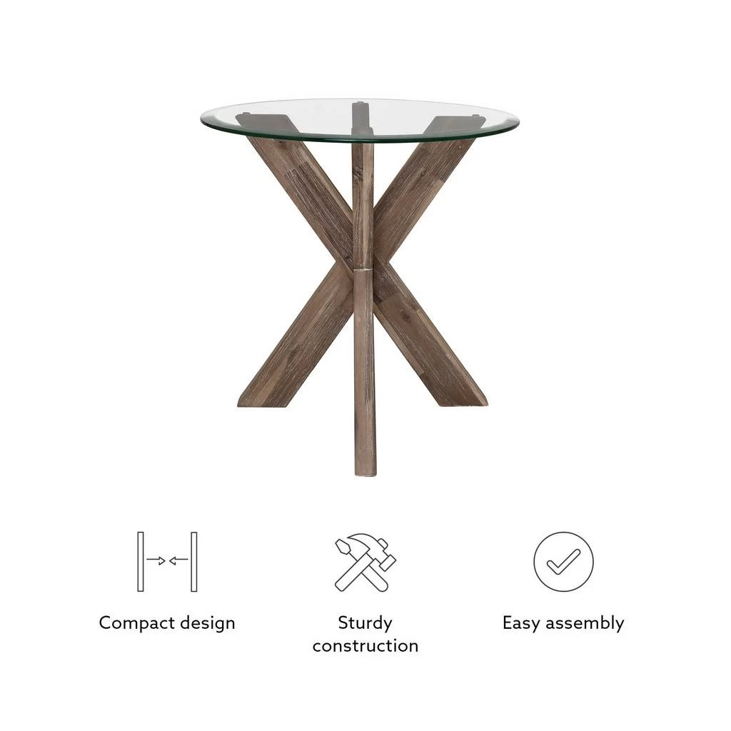 Update your space with this stunning contemporary side table. A beveled transparent glass top is paired with a crisscross wood base for a midcentury modern feel with an industrial edge. The beautifully crafted acacia legs are stained with a natural finish that creates a rustic look while protecting its beauty and character. The compact round design works well in both large and small spaces. Nestled between living room chairs or in a corner, this piece will be a versatile addition to your furniture ensemble.