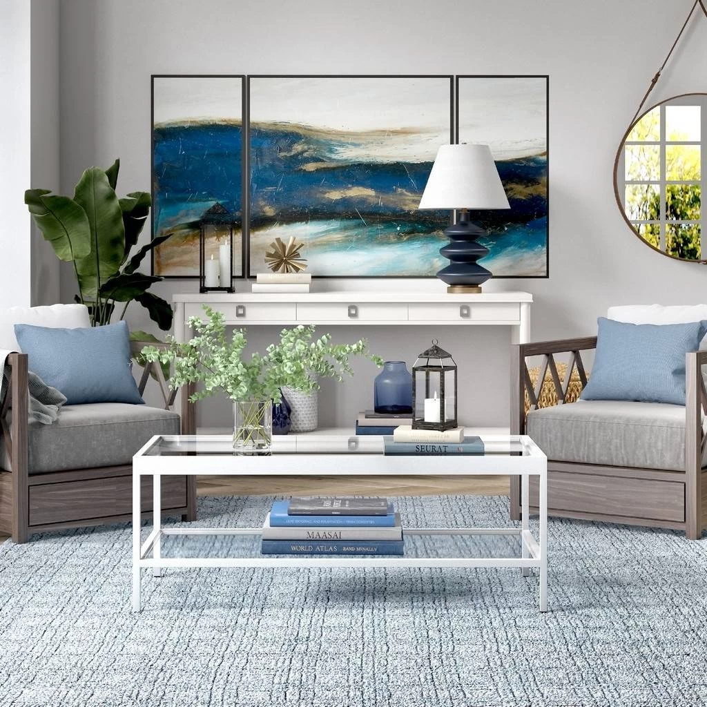Clean, minimalist lines and sturdy tempered glass make this coffee table perfect for your contemporary . Proudly display knick-knacks, magazines and more on the clear glass top and lower shelf. The streamlined look and neutral metallic finish pairs seamlessly with your existing color scheme and décor style.