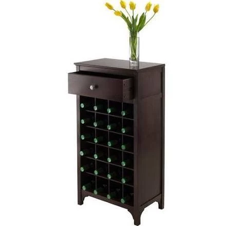 Add this compact Ancona Wine Modular unit to your home. Create a unique look with one unit or any combination of the three styles available. This unit has a drawer for your accessories and holds 24 bottles. Overall assembled size is 19.009″W x 12.60″D x 37.52″. Insider drawer dimension is 15.47″W x 9.25″D x 4.65″H. Individual wine cubby is 4″W x 3.9″H x 11.1″D. Made with combination of solid and composite wood in Dark Espresso Finish. Assembly Required.