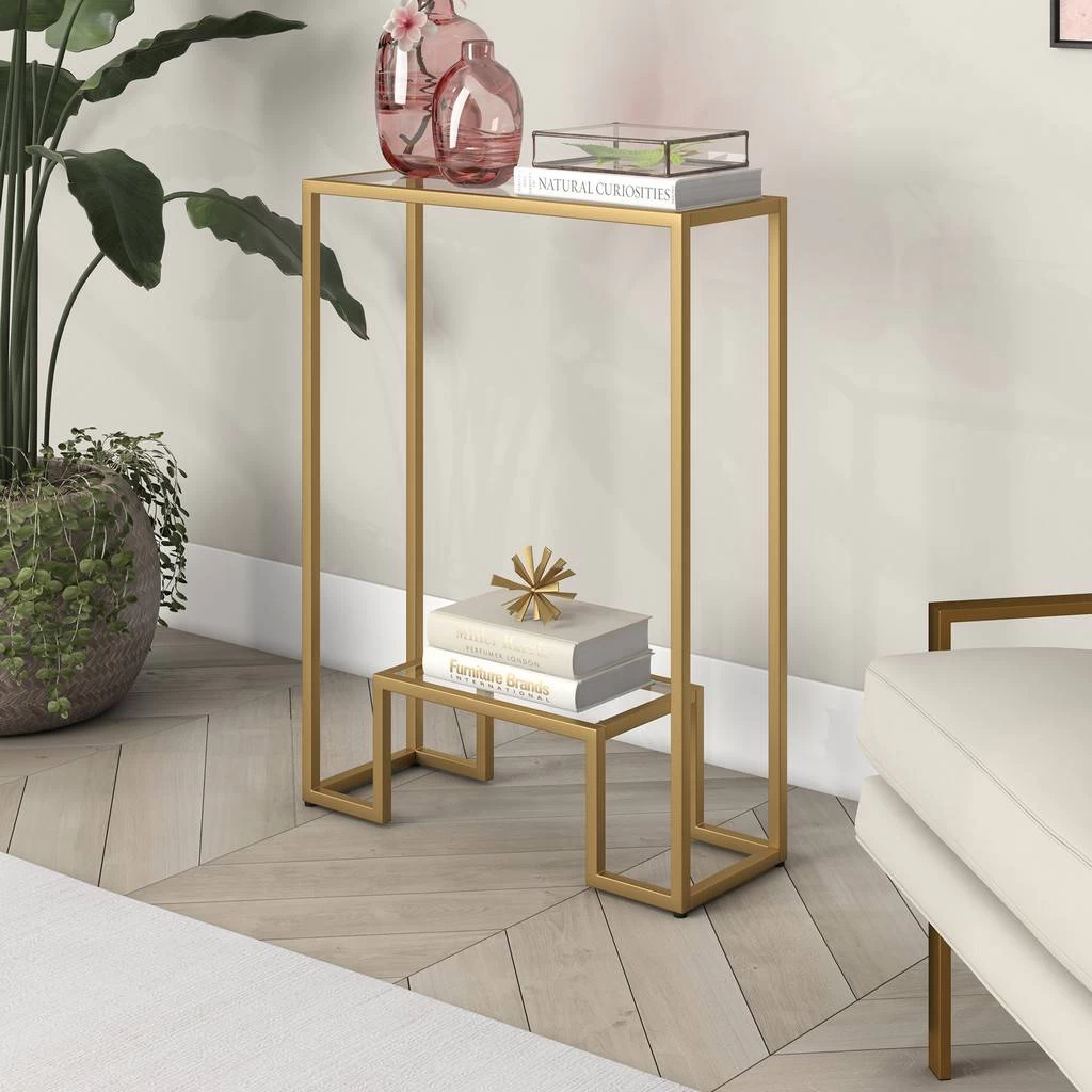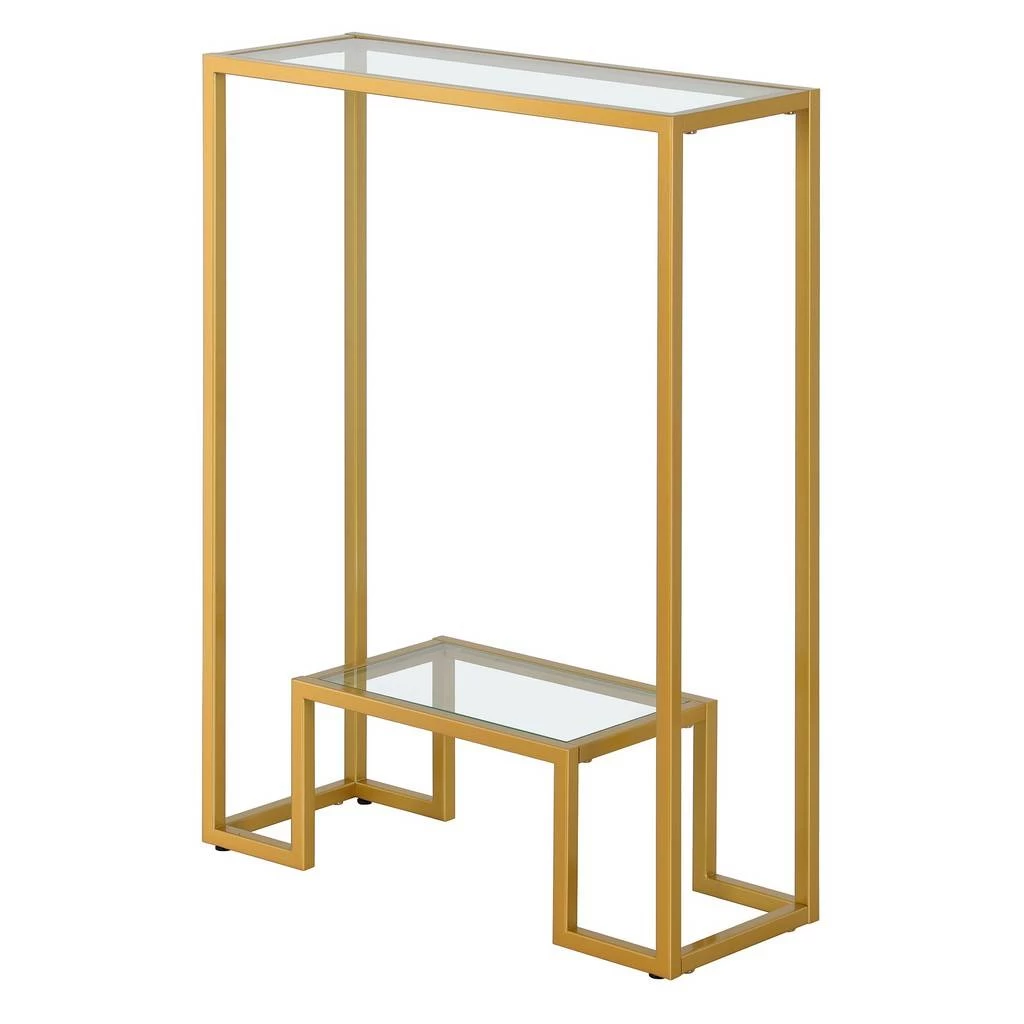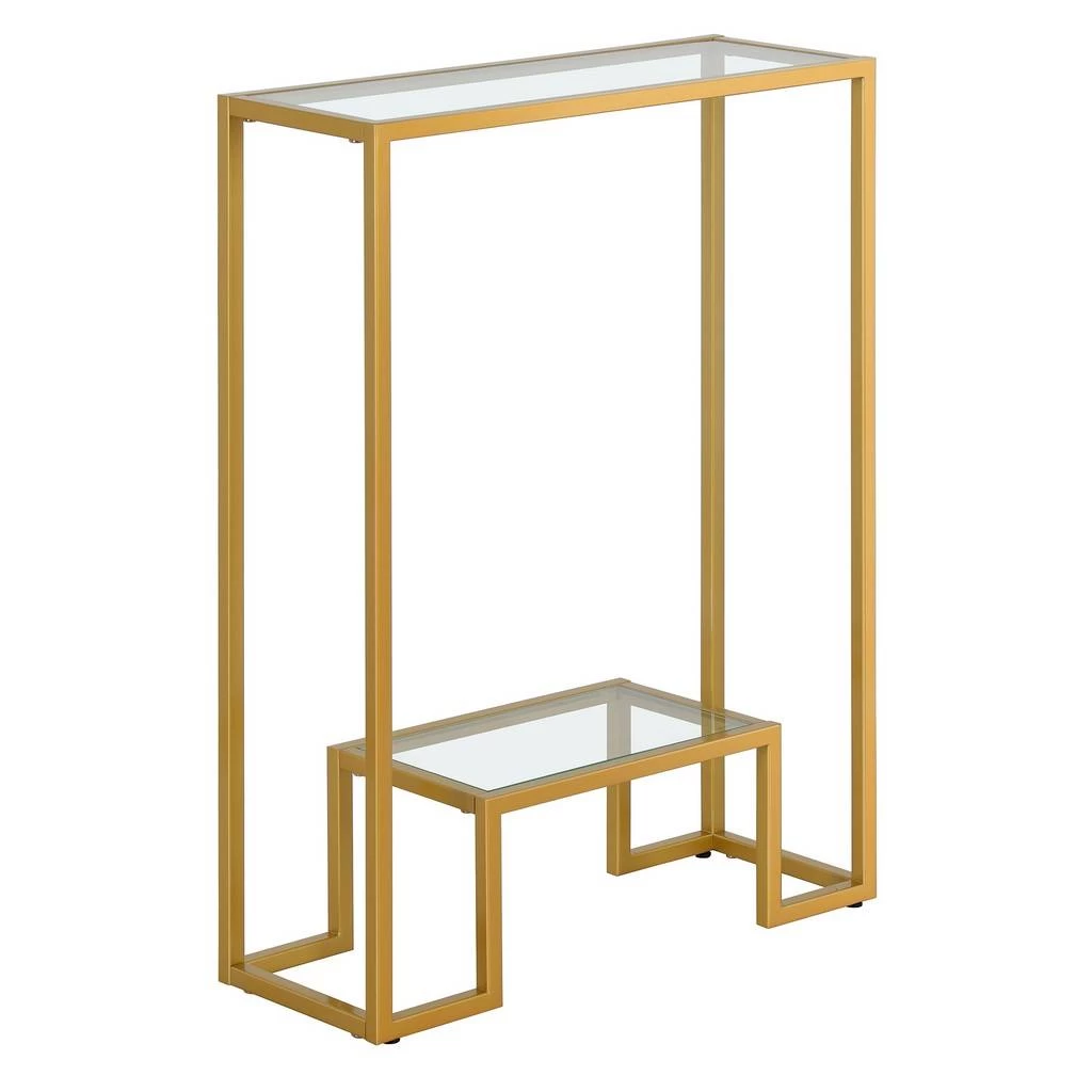 Bring streamlined design to your or entryway with this modern mini console table. Crafted of steel in a handcrafted finish, this console table features a tempered glass tabletop that provides a perfect platform for framed photos or a pair of stylish lamps. A raised glass shelf adds visual interest and creates extra storage space wherever you need it most.