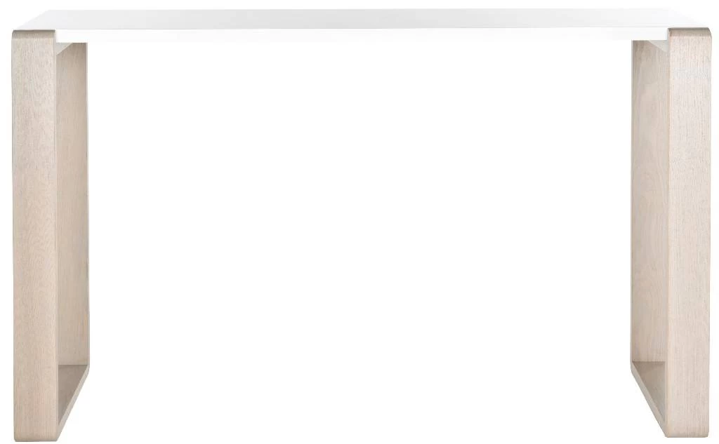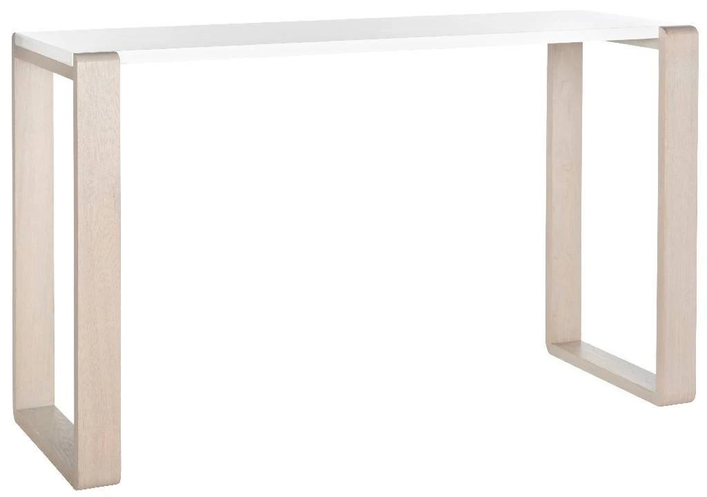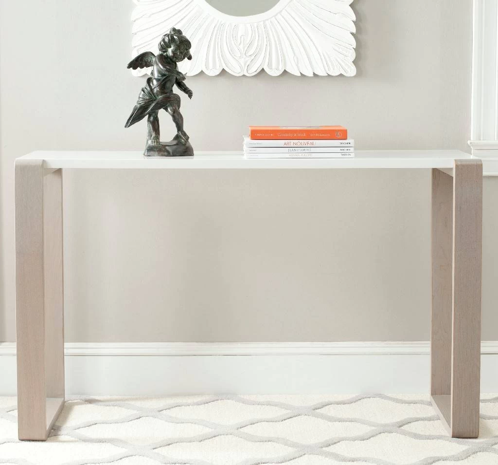 Rugged meets refined in the contemporary Bartholomew console table with white lacquer top and chunky wood grained base in a chic grey-wash finish. Whether set in a penthouse or loft, this dramatic console will command attention in a or hall.