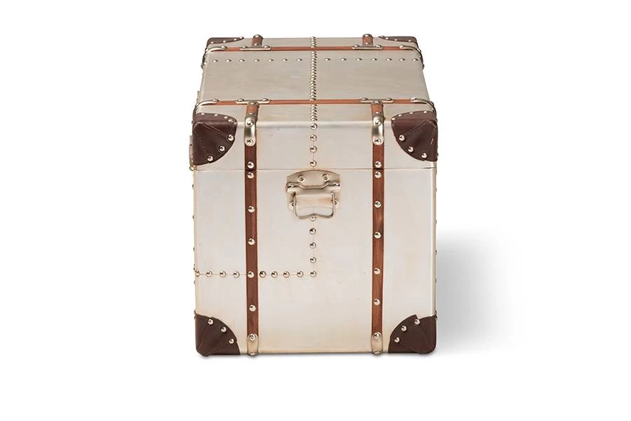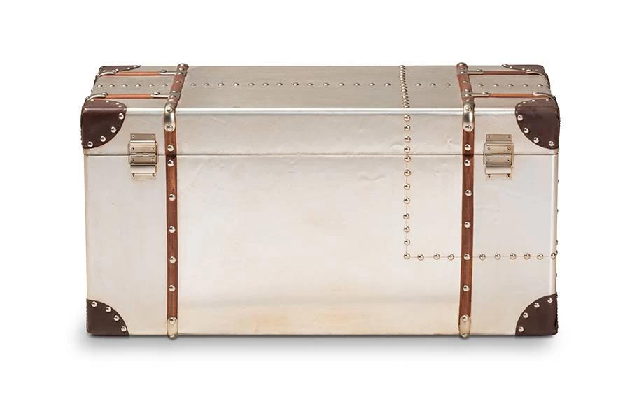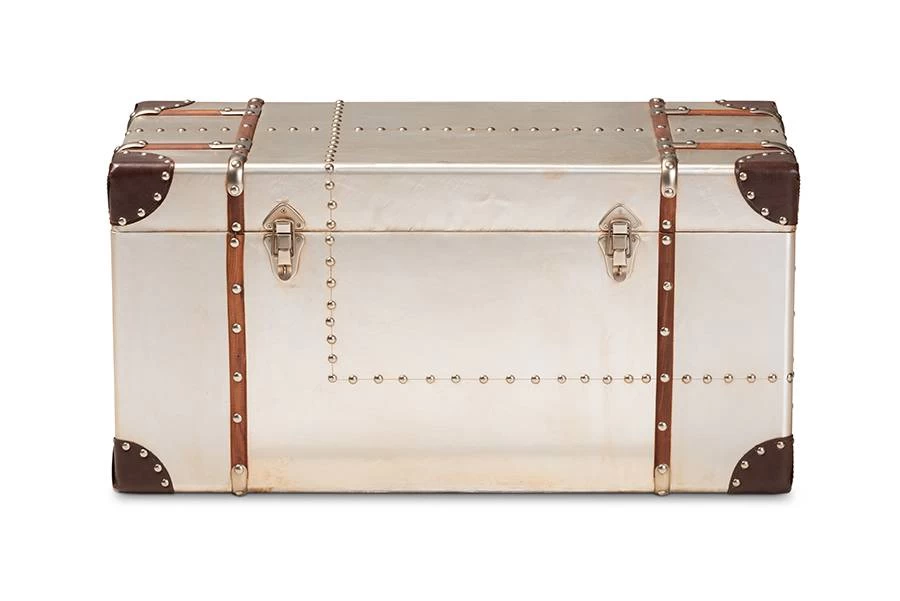 Add cool, vintage industrial-inspired storage to your space with the Bechet trunk. Constructed from MDF wood and silver metal, the Bechet features a spacious inner storage compartment. Modeled after antique steamer trunks, the Bechet is accented with silver metal handles and imitation locks. Dark brown faux leather corner protectors and silver metal rivets add an extra dose of industrial style. Use the Bechet to store extra blankets, pillows, and more. The Bechet trunk is made in China and will arrive fully assembled.