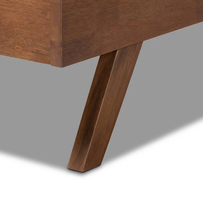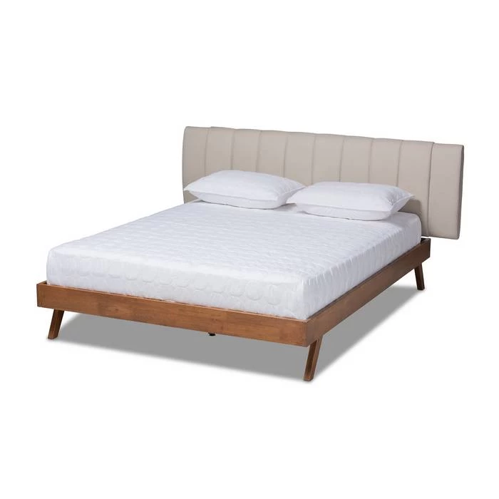 With its clean lines and low profile, the Brita bed adds cool retro style to your . Inspired by mid-century modern design, this wood bed is built with a low platform set on top of angled legs. The warm walnut brown-finished wood frame is paired with a soft, chic fabric upholstered headboard that provides a comfortable spot to lean against. Its extended width and channel tufting add a sleek, modern feel. The Brita bed is made in Malaysia and requires assembly.