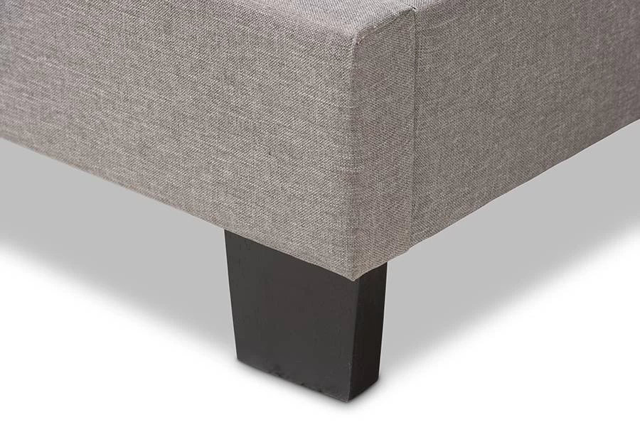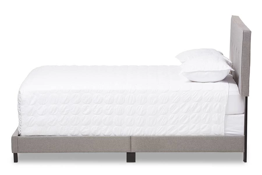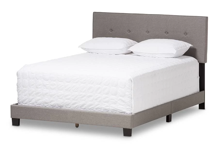 Complete your with the Hampton fabric upholstered bed. Featuring modern design with button-tufted headboard for a touch of traditional charm and detailed piping for a sophisticated finish look, the Hampton is constructed of solid rubber wood legs and engineered wood. The solid wood legs in black will keep it sturdy and reliable for years to come. Light grey upholstery adds a gentle finishing touch over the padded bed frame. Low footboard and the matching rail creates an airy feel to a small room setting. A standard US size box spring and mattress will complete the Hampton full-sized bed for an elevated bed height and a good night sleep. Made in Malaysia, the Hampton requires assembly.