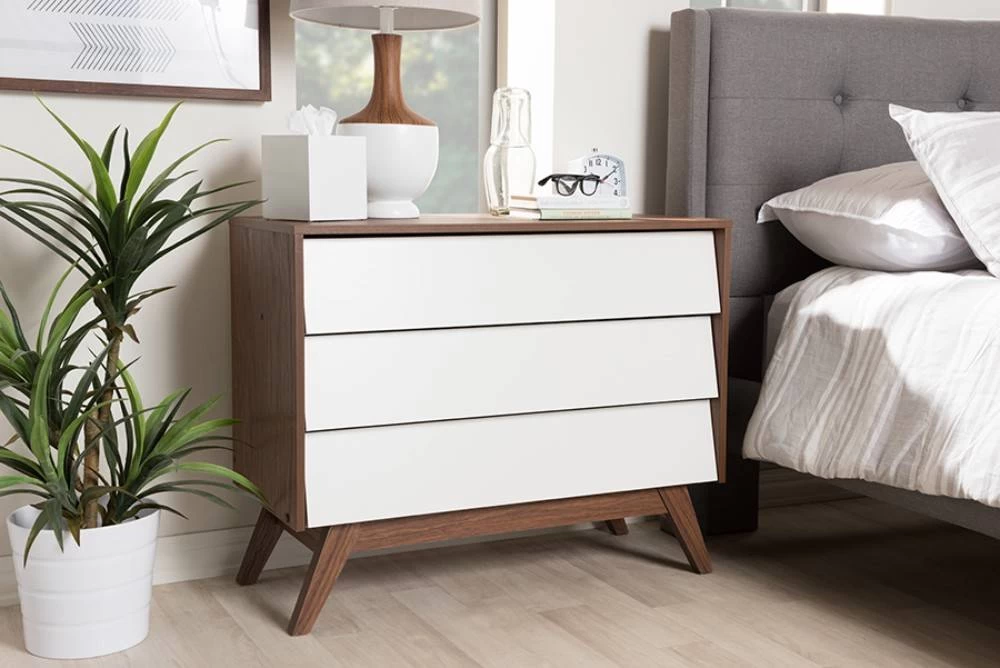 Featuring two-tone finishing in walnut and white, the Hildon is a mid-century modern collection that will attract all of the attentions. The slanted design of the drawers gives it extra character and individual style while the splayed legs showcasing the retro modern look of the collection. Constructed of engineered wood, the Hildon 3-drawer storage chest provides you with extra storage space for your lingerie’s, linen and clothes. Set on four walnut finished legs which elevate the drawers from the floor, this storage chest of slanted drawers are a great addition to any . The Hildon sets a tone for any room which is what mid century style is all about. Made in Malaysia, the Hildon 3-drawer storage chest requires assembly.