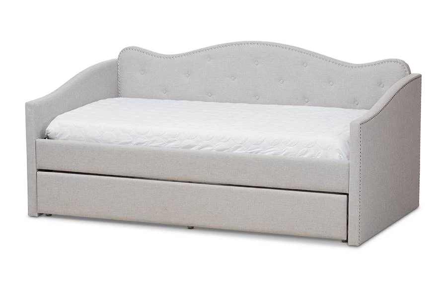 A timeless style with graceful curve and button tufted design, the Kaija fabric upholstered daybed is perfect for use in the home where space may be a little restricted; an elegant addition to any interior. Constructed of solid rubberwood and plywood, the Kaija is foam padded and upholstered throughout for your ultimate comfort. Featuring sloping side panels with matching curvy back panels, the Kaija showcases the details of an updated piece of modern furniture. Floating back buttons and silver nail heads trim complete the design elegantly. 3-In-1 Kaija daybed comes with a twin roll-out trundle, so it can accommodate up to two overnight guests. It’s a sofa! It’s a bed! It’s another bed! Made in Malaysia, the Kaija requires assembly.