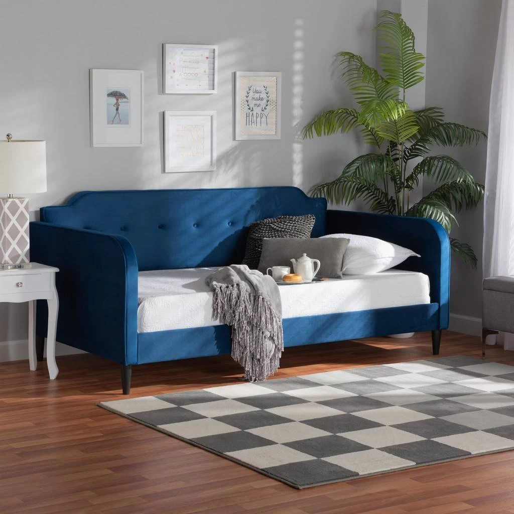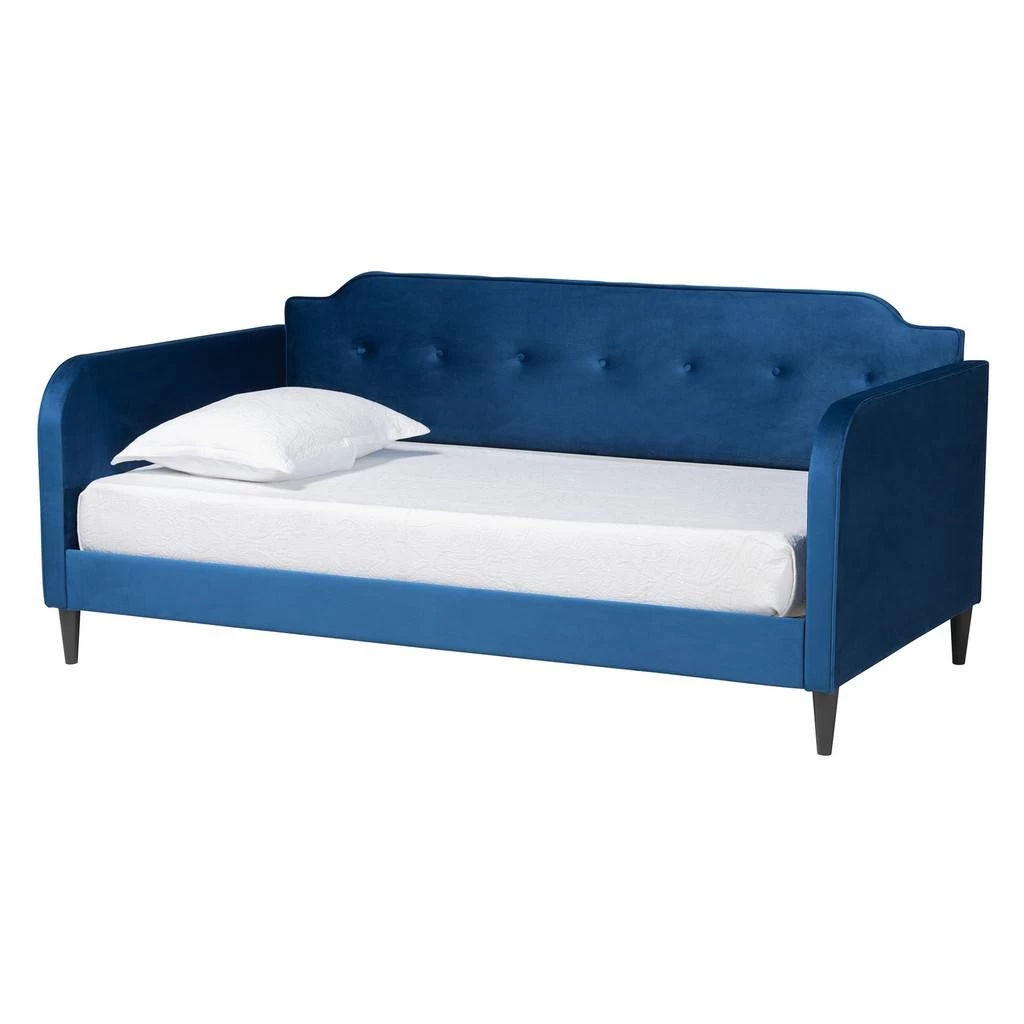 Take a break from routine to relax and rejuvenate in the remarkable Kaya daybed. Made in Malaysia, this stunning piece consists of a solid wood frame padded with foam and upholstered in lavish velvet fabric. Smooth curves and rounded angles lend a pleasant silhouette while button-tufted adornments exude contemporary elegance. The Kaya requires assembly and utilizes wood slats for mattress support, eliminating the need for a box spring. Tapered legs complement the streamlined design, making the Kaya daybed a refined addition to any layout.