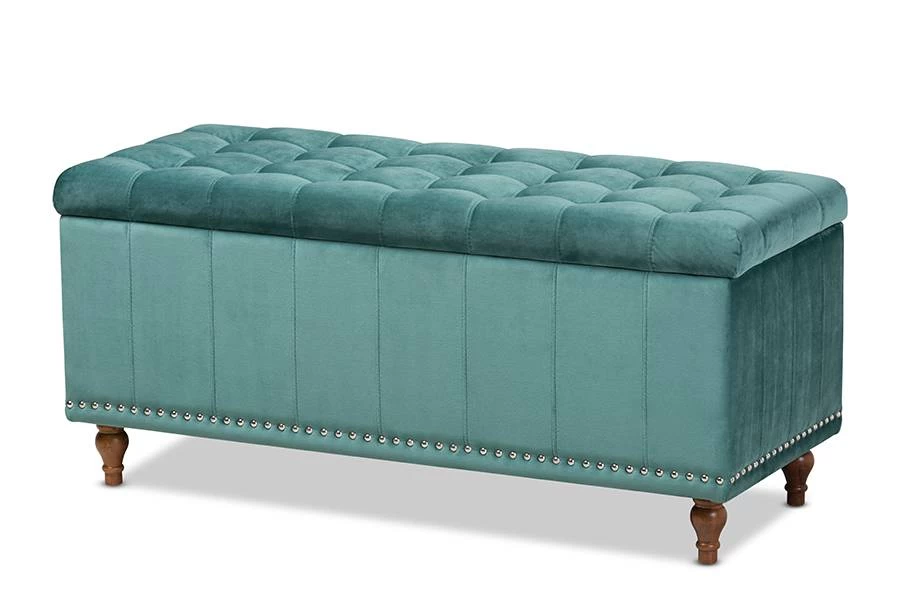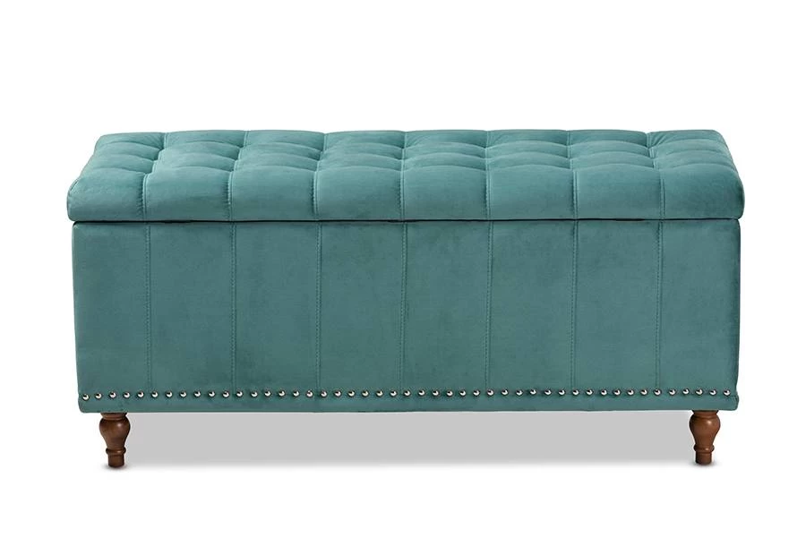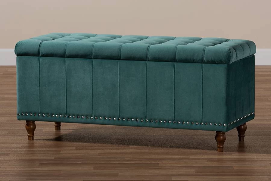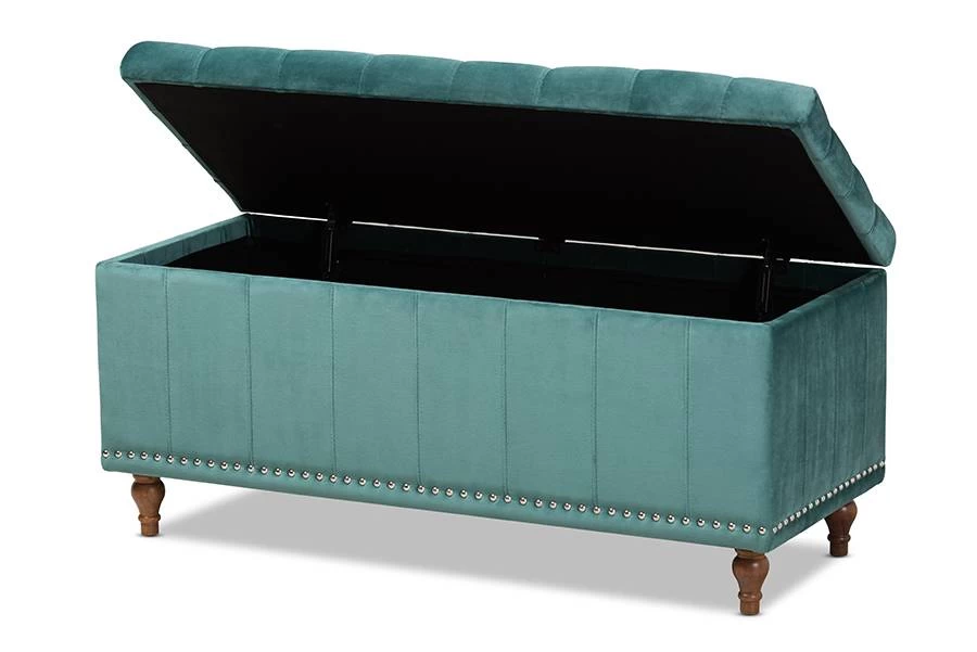 Whether placed in the or , the Kaylee storage bench offers elegant style and handy storage space. Constructed from rubberwood, the Kaylee is upholstered in a soft velvet fabric that adds a dose of glamour to your space. The top is foam padded for seating comfort and opens to reveal ample storage space for extra blankets and linens. Silver nail heads and grid stitching lend a modern look, while button tufting and turned feet add a refined elegance. The Kaylee storage bench is made in Malaysia and requires leg assembly.