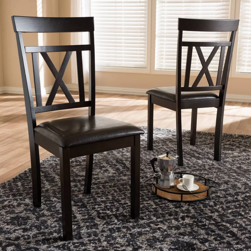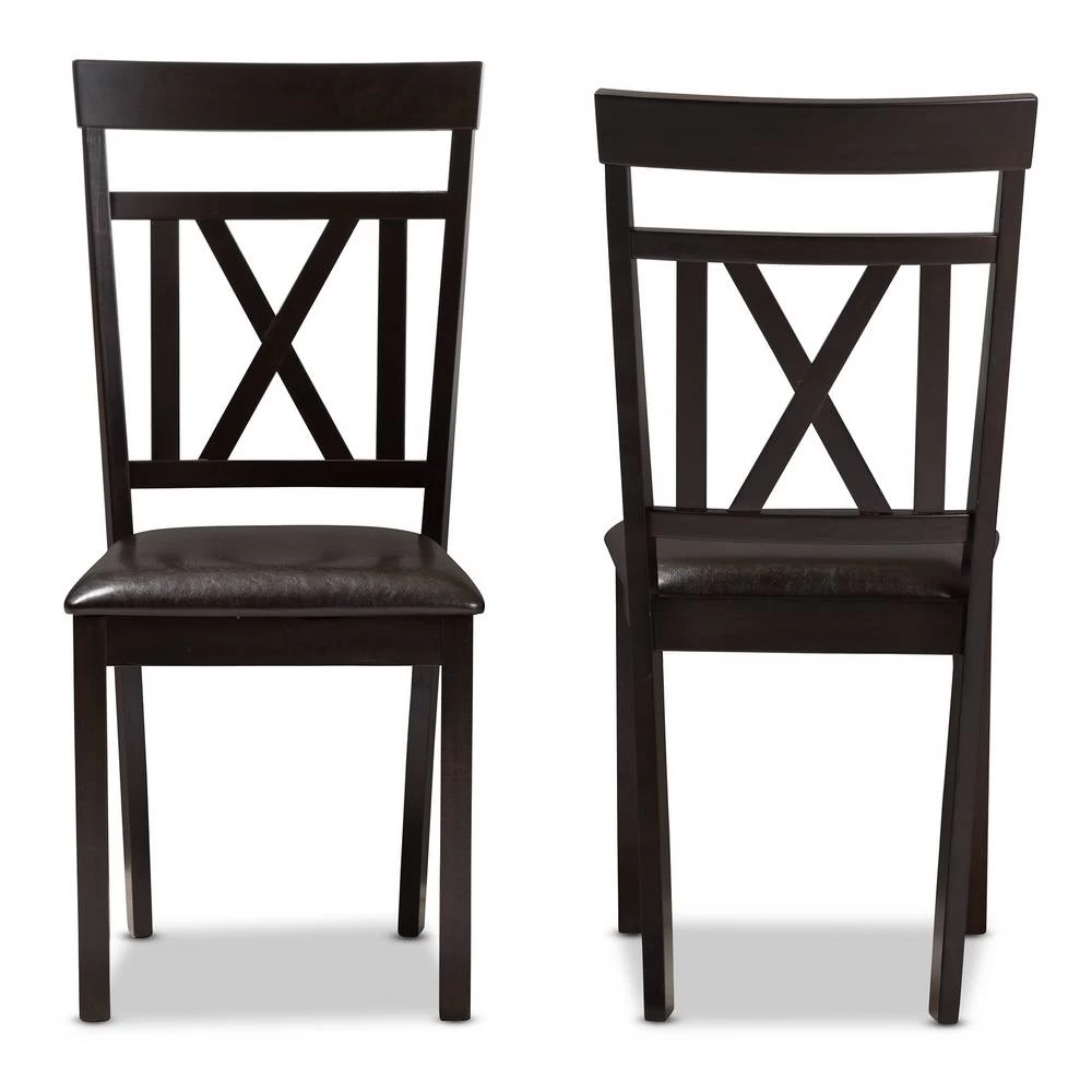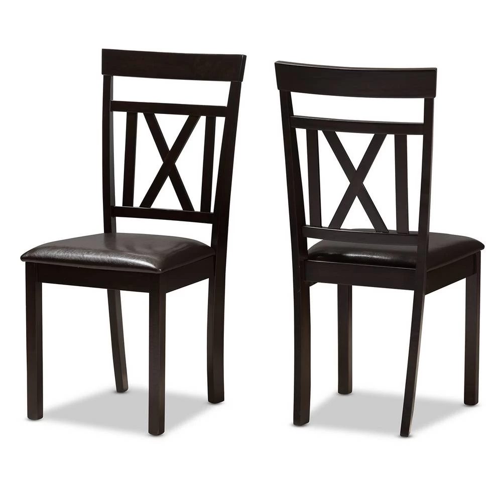 Our Rosie modern and contemporary 2-piece dining chair set celebrates simplicity by combining timeless and contemporary elements. The chairs’ high, X-back design offers comfort and grace. Dark-brown, wenge-finished wood matches perfectly with dark brown faux leather padded seats. Featuring tapered legs, the Rosie imbues modern essence. Made in Malaysia, the Rosie dining chair requires assembly.