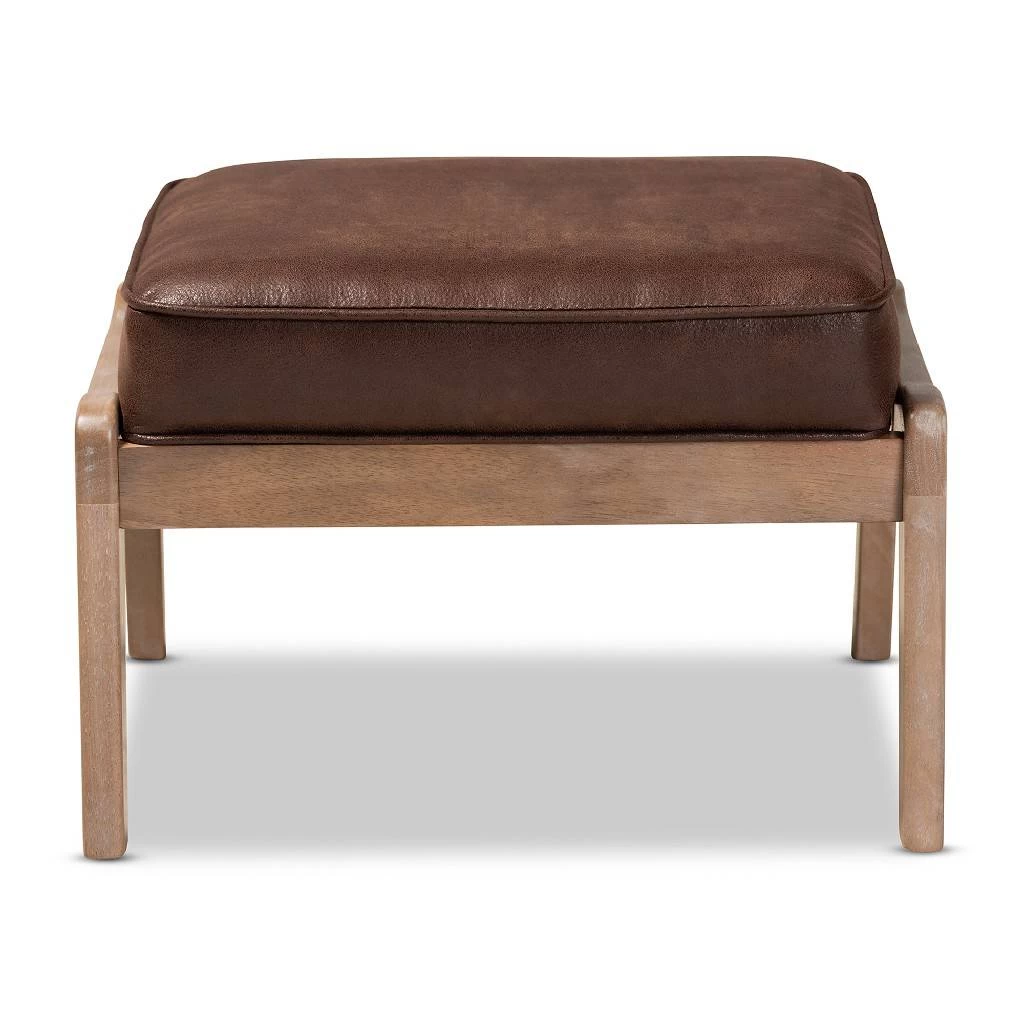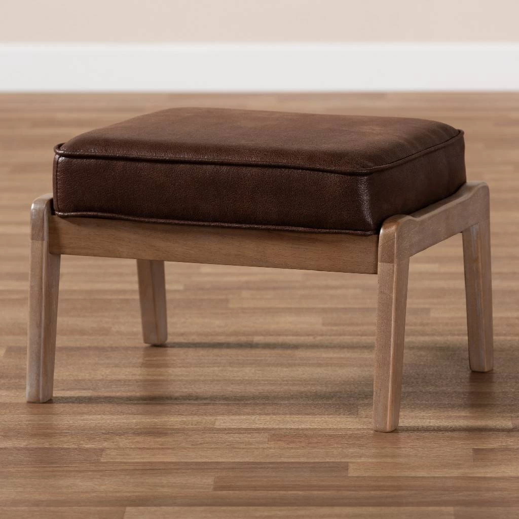Add a cozy, retro accent to any space with the Sigrid ottoman. Featuring a low profile and wide, angular frame, the Sigrid displays all the hallmarks of mid-century design. The seat is upholstered in a sleek dark brown faux leather effect fabric and is padded with foam for the utmost comfort. Its durable rubberwood frame displays an antique oak finish for a chic, vintage look. Striking from any angle, the Sigrid is well suited for use as seating or as a footrest. The Sigrid ottoman is made in Malaysia and requires assembly.