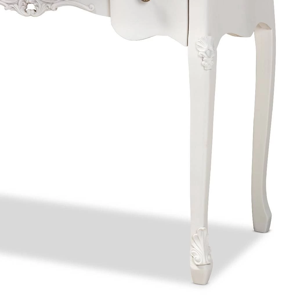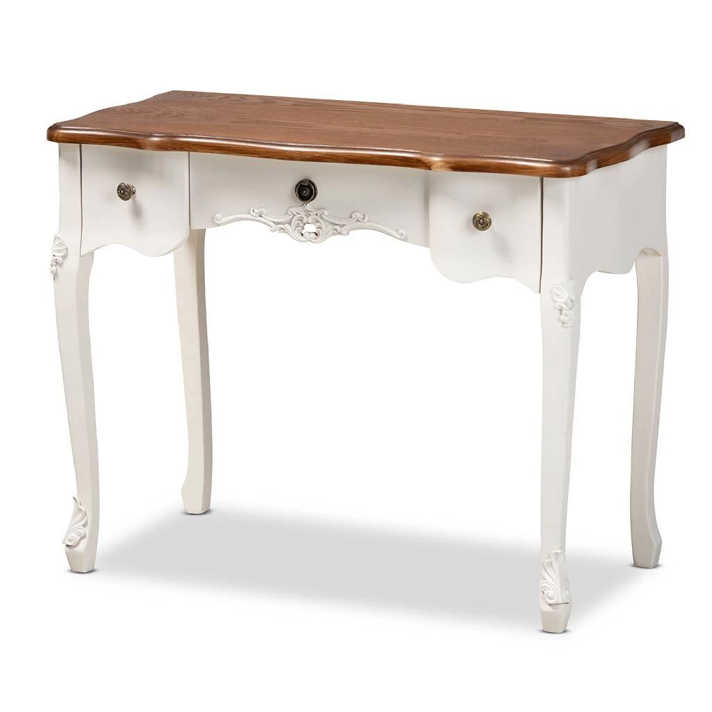 Display your favorite pieces of on the charming Sophie console table. Constructed from wood, the Sophie features three drawers with space to store keys, bills, and more. Its classic white finish complements the brown wood tabletop and highlights the stunning attention to detail in the floral moldings. Carved brass knobs and cabriole legs add a delightful French-inspired look. This versatile piece is well suited for use in an entryway, hallway, or . The Sophie console table is made in China and requires assembly.