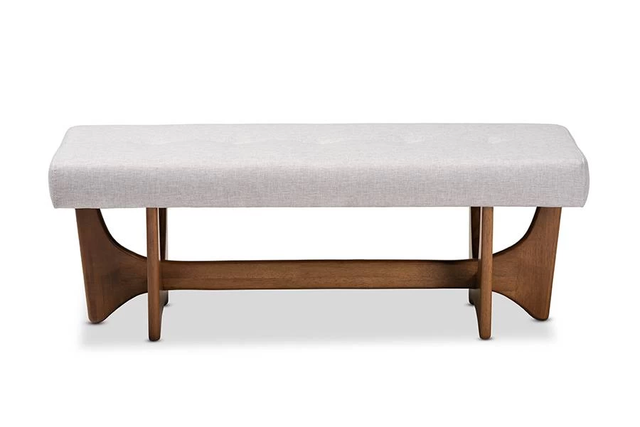 Smooth curves and netural tones make the Theo bench a chic addition to any space. Constructed from wood, the Theo is upholstered in a soft grey polyester fabric. Plush foam padding provides comfortable seating, while button tufting adds a tailored look. The seat is set on a unique base of interlocking forms, each finished in a walnut brown. Place this bench in the entryway, , or . The Theo bench is made in Malaysia and requires assembly.