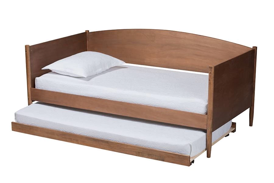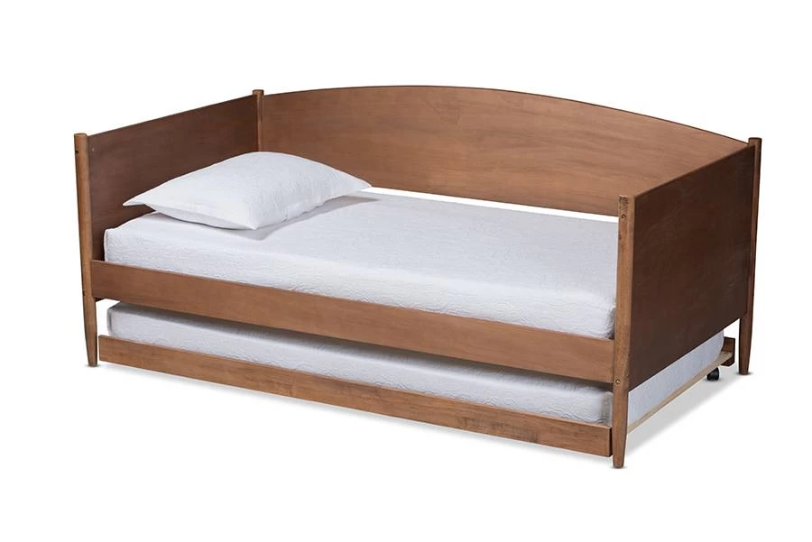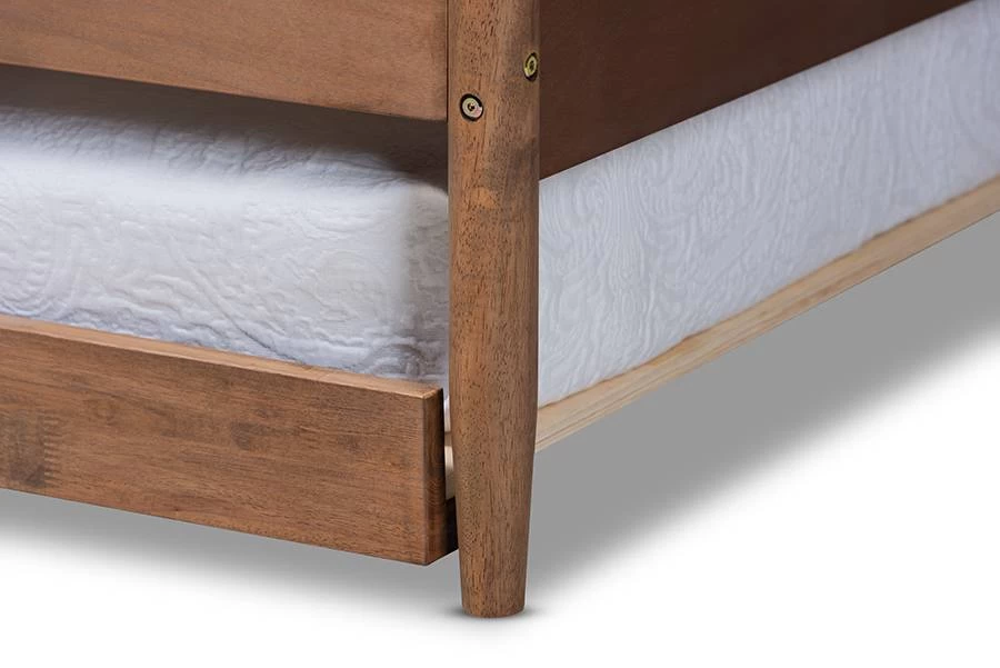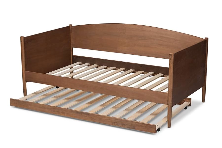 Create a mid-century retreat in your or guestroom with the Veles daybed. Clean lines and natural wood grains give this daybed a simple, yet refined appeal. Its warm walnut brown finish makes it easy to coordinate with any color palette. Smooth, solid panels provide sturdy support for you to lean against as you read or watch TV. Tapered legs complete the look. Stylish and versatile, the Veles is fitted with a pull-out trundle to provide conveneient accomodation for overnight guests.The Veles daybed is made in Malaysia and requires assembly