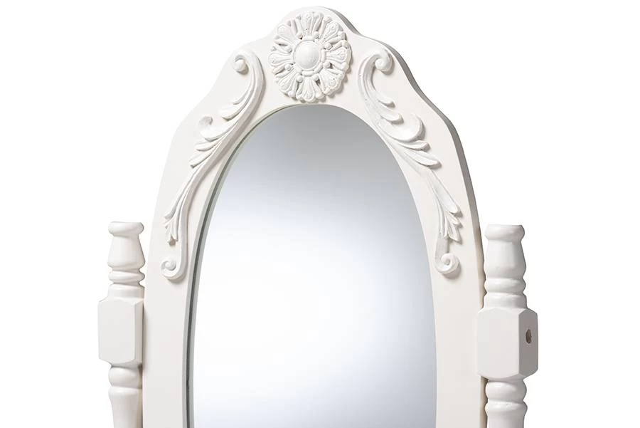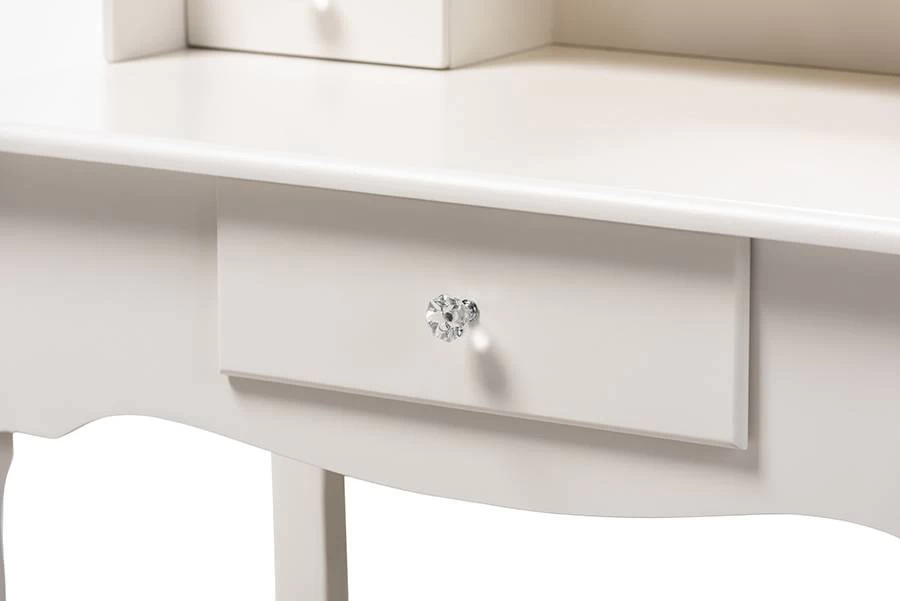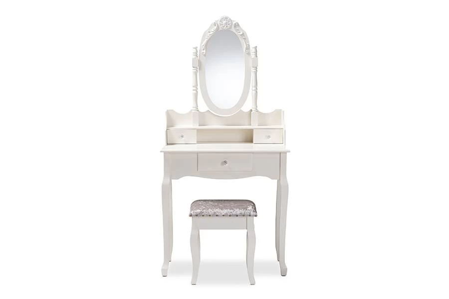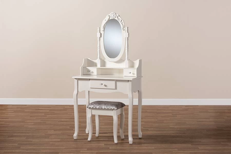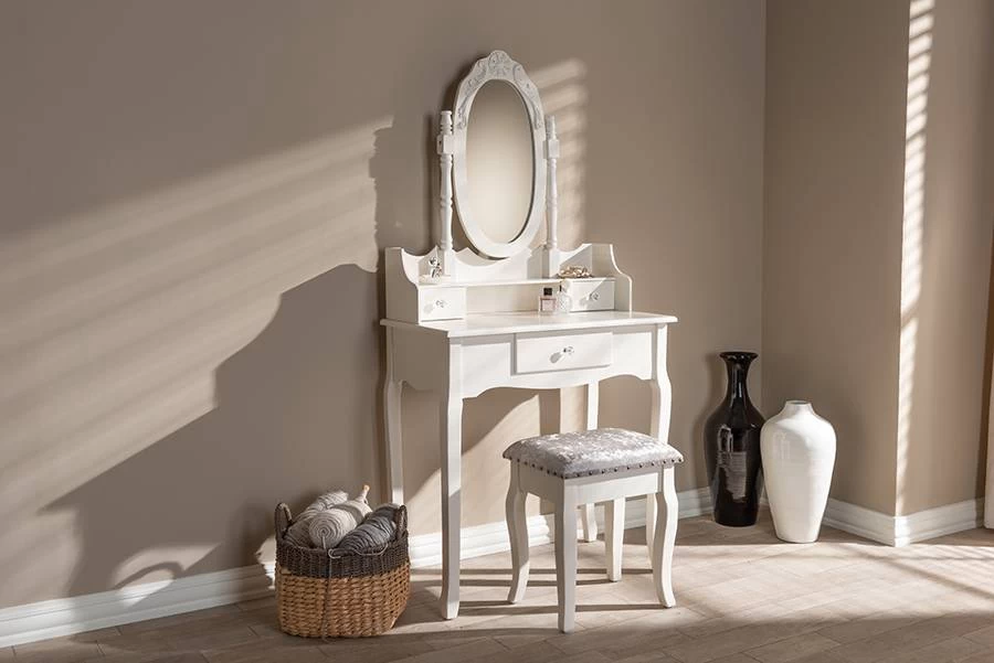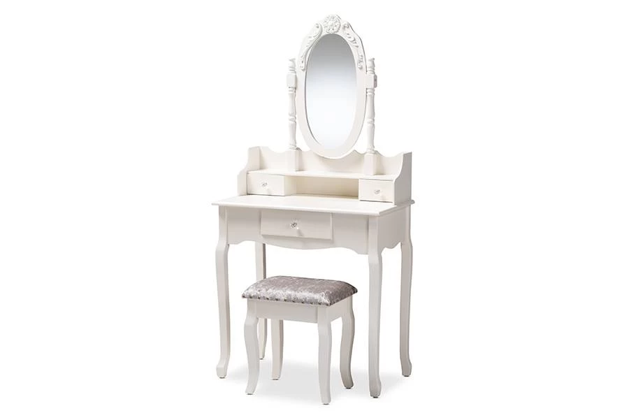 Establish an elegant space for your makeup routine with the Veronique vanity table and ottoman. This charming vanity features a large tabletop and three drawers with space to store cosmetics, perfume, and more. Inspired by French provincial furniture, the Veronique showcases cabriole legs and an intricately carved mirror frame. The vanity is accompanied by a matching ottoman upholstered in velvet and padded with foam for the utmost comfort as you get ready for the day ahead. Constructed from solid MDF wood, the Veronique set will be a fixture in your for years to come. The Veronique vanity table and ottoman are made in China and require assembly.