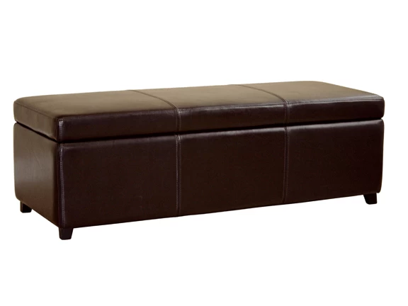 Perfect for the foot of your bed or an entryway, this convenient storage bench offers sturdy, dependable seating. Additionally, spacious storage space is revealed when the top lid is lifted. Safety hinges prevent the lid from slamming shut. Stash away shoes and umbrellas for an entryway bench or extra pillows and blankets when used as a trunk at the end of your bed. The surfaces are lightly padded and then upholstered in durable dark brown bycast leather. The feet are black wood and include non-marking feet to protect your flooring.