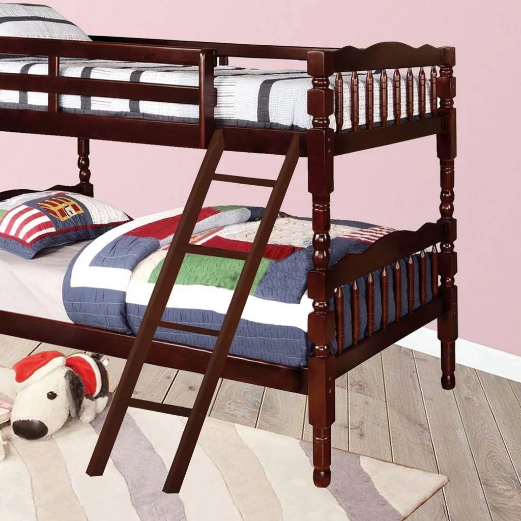 The Better Home Products Charlotte Twin Over Twin Solid Wood Bunk Bed is a midcentury style iconic family favorite. Its strong & sturdy construction, full-length safety guardrails, durable 5-step ladder, and unique fastening systems make the Charlotte the perfect choice for kid’s bed. The classical style of the Charlotte makes it easy to coordinate with your other furniture and kids’ décor, while its rounded edges give it a smooth, refined look. This pine wood bunk bed comes in three trendy colors: Mahogany, Natural and Tobacco – that will make sure to accentuate any room. It accommodates twin size mattress on both levels and does not require additional foundations. Assembly required by 2 adults.
