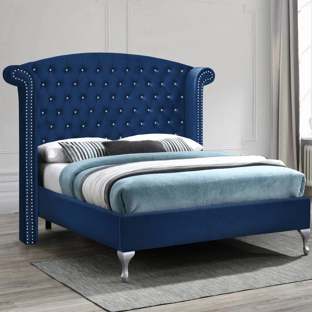 Revamp your space with this sumptuously crafted Better Home Products Cleopatra Crystal Tufted Velvet Platform Full Bed. The star of the show here is the headboard with wingback design‚ decorated with large vibrant crystals and decorated with nail-heads that not only keep its thick padding in place and aloft, but also add a classic look to your space. Luxe velvet upholstery feels luxuriously upscale to the touch, and the high headboard and matching furniture add a timelessly contemporary silhouette to your space. Available Full, Queen and King size in Blue, Black and Gray color finish options. Assembly Required.