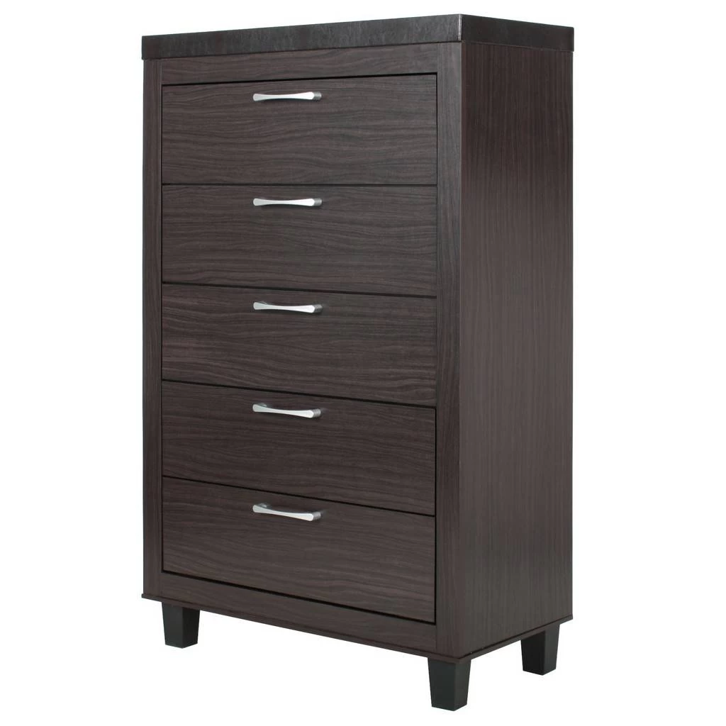 Effortless, clean style is exactly why we adore the Better Home Products Elegant 5 Drawer Chest of Drawers for Bedroom. Its relaxed vibe creates warm feelings of leisure in your space. Crafted from premium laminated engineered wood, this 5-drawer dresser comes partially assembled in a box. The drawers run on metal glided with safety stop, plus beautiful silver finish plastic bar handles give off a modern country style feel. The faux leather upholstered top and black plastic legs add a delightfully homespun charm to your space. Available in tobacco and white color finish. Partial assembly required.
