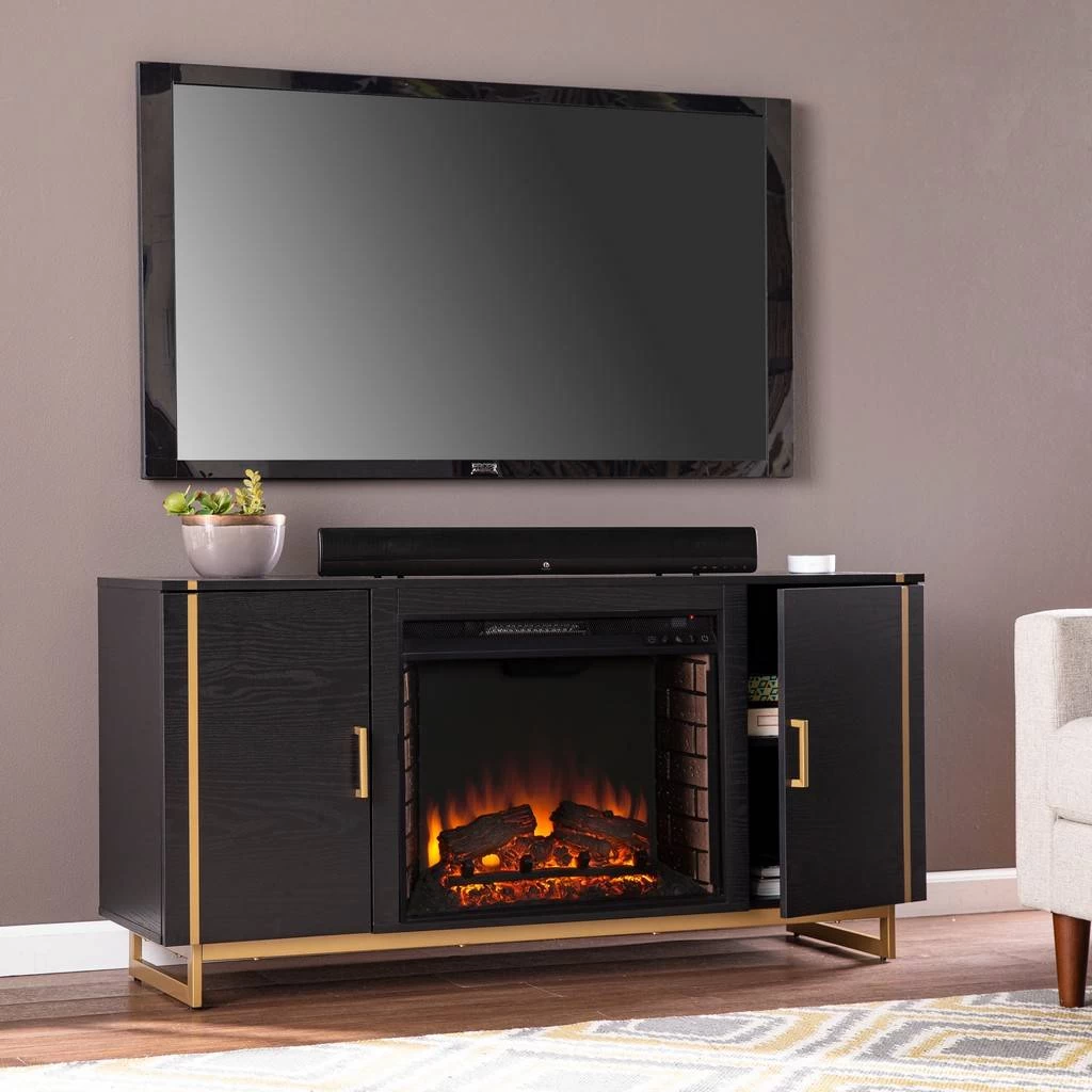 Turn on chic style with this electric fireplace console. Gold accents add a sleek, modern feel to your living space, while soft-close doors conceal DVDs and video games. Lifelike LED flames and remote-controlled features bring stylish comfort to your family room or den, working with or without heat for enjoyment in all seasons. Feel fired up about movie night at home when you gather around this media fireplace in your living area or media room.