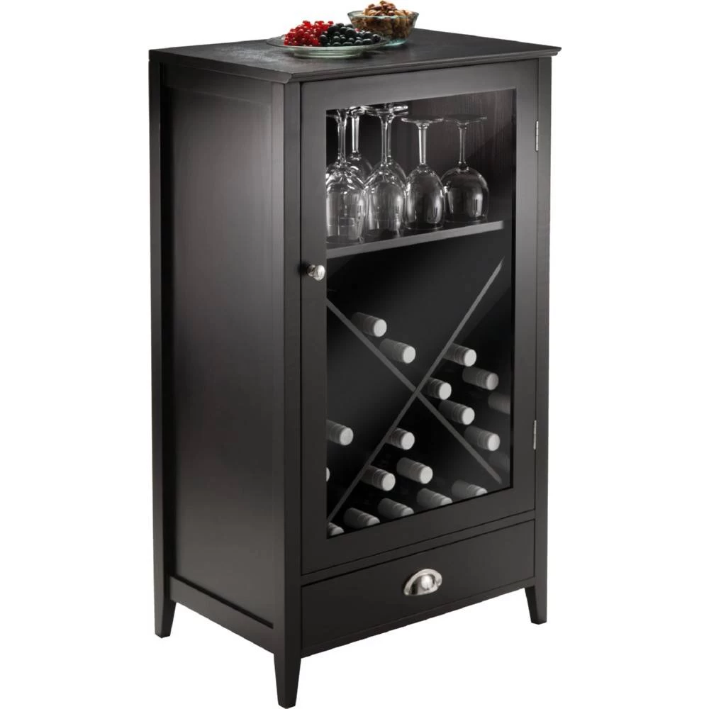 Bordeaux Modular Wine Cabinet with X Shelf is a great addition to your home. The simple design has straight lines and a dark finish. Perfect storage piece for the wine enthusiast. The cabinet provides spacious single drawer for your accessories, storage shelf and X shelf for your wine bottles. Create a wine storage system with additional units and sit side by side. Opens glass door to an open shelf for your glasses or sprits. Lay your wine bottles nicely with this X Shelf can store up to 24 bottles. Clear Glass Door with dark wood frame. Overall assembled size is 22″W x 16″D x 40″H. Cabinet is made with combination of solid and composite wood in espresso finish. Assembly Required.
