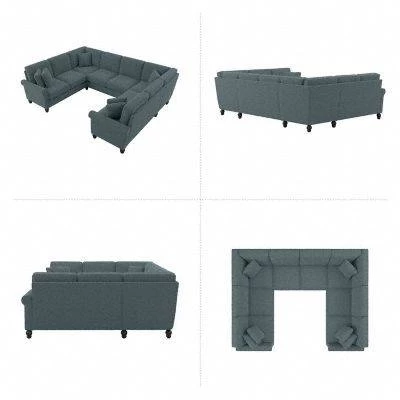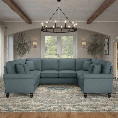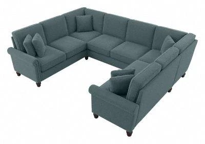 The Bush Furniture Coventry 113W U Shaped Sectional Couch presents a practical living room seating solution with remarkable quality and durability to match its classic style. Conveniently packaged for easy movement into and around any room or tight-fitting corridor, this ready-to-assemble U shaped couch with matching pillows is a great way to furnish a small apartment, large home and everything in between. Enjoy the company of friends and family or take a moment to relax by yourself on a sectional sofa with high-density foam cushioning and pocket coil seat springs that maintain their shape and feel for years of comfort. Reversible seat and back cushions feature -friendly StainGard(TM) fabric that repels dirt, oil, water and other liquids to prevent unsightly blemishes. The sturdy metal and wood framework includes a quiet sinuous spring design with cross supports that won’t sag over time. Espresso-stained rounded bun feet, rolled armrests and nailhead trim reflect a sophisticated style that perfectly complements French country, farmhouse, coastal and traditional . Herringbone upholstery options are available in several colors for a look that matches any space and taste. This living room sofa has been rigorously tested for safety, durability and stain resistance and is backed by the Bush Furniture 1 Year Manufacturer’s Warranty. Add to your living room set with an array of coordinating Sofas, Sectionals, Ottomans and Accent Chairs (sold separately).