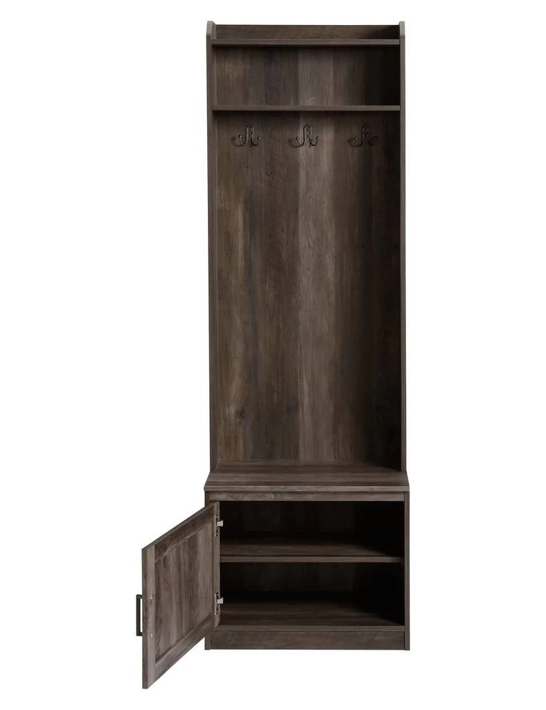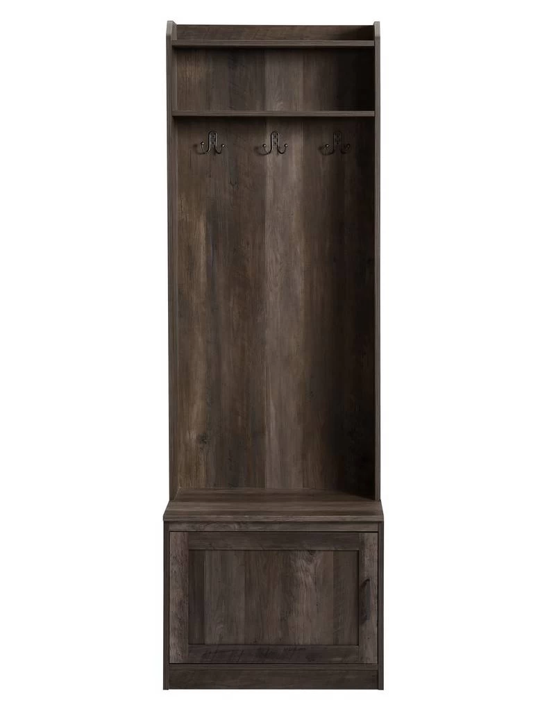 This attractive espresso finish hall tree is perfect for any entryway. or homespace needing storage for coats and hats. Dark Bronze hardware perfectly accents wood finish and the lower cabinet under bench gives plenty of storage for shoes and accessories making this piece versitile as it is beautiful.