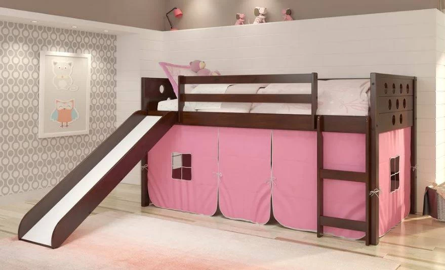 Circles low loft bed makes a small room fun, with large under bed area for storage or play. The Circles design can make a room easy to decorate and give it a warm inviting look. Pink tent fabric makes a fun play area or the area below bed can be used to store things and tent covers them up. The slide makes for a great way to start the day. This Donco Kids product will give your child years of enjoyment. Donco provides many different styles and colors to choose from.