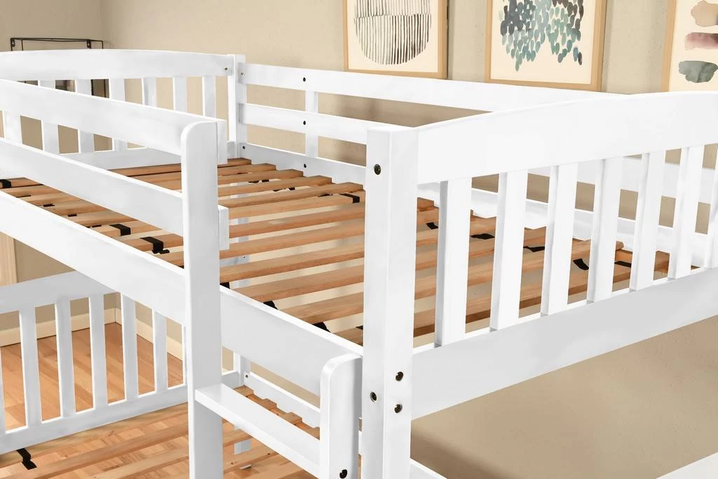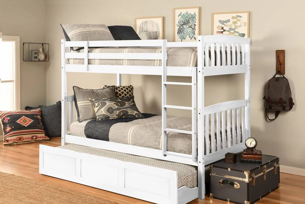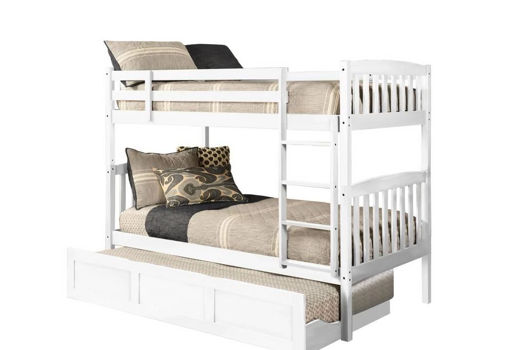 Strong, classic slat design and adaptability make this solid wood, twin-over-twin bunkbed the perfect choice for your home décor. The top bunk has a safety rail and a sturdy ladder to climb; plus an additional trundle for a third bed — ideal for your youngsters. This bunkbed is great for when you have children sleeping in the same room, but, you can split the bunkbed into two twin-sized beds.