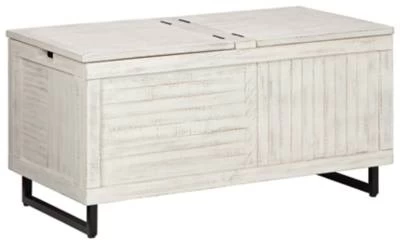 This dual hinged Coltport storage trunk marries function and casual style like never before. The distressed white finish complements any room, while the striped front and sides create a dynamic texture that is sure to impress.
