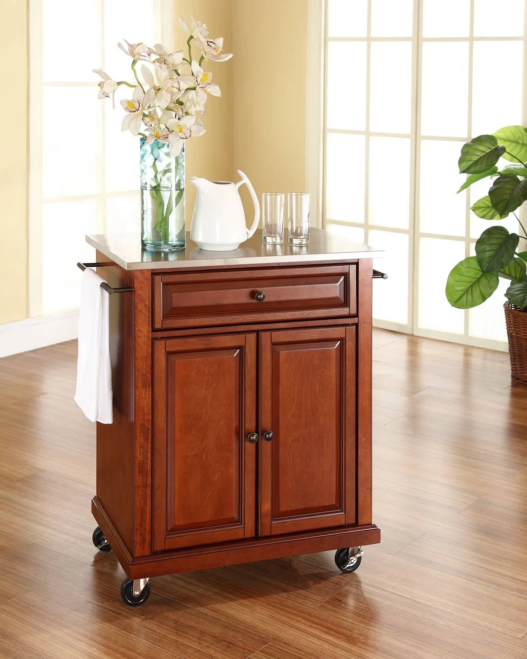 Save space while adding mobile storage with the Compact Kitchen Cart. Featuring a large cabinet with an adjustable shelf, this cart easily stores pots, pans, or small appliances. Two towel bars and a full-extension drawer are perfect for keeping dishtowels and utensils close at hand. With a beautiful stainless steel countertop, plus heavy-duty casters for mobility, the Compact Kitchen Cart is a welcome addition to your kitchen space.