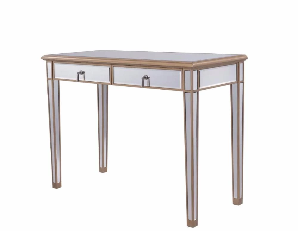 Enhance your or dressing area with this contemporary mirrored 2-drawer dressing table with a slight antique flavor — it features a hand-rubbed gold finish and brushed steel ring pulls. Providing both utility and sophistication, the clean lines and polished mirror surfaces of this piece add distinction and beauty to wherever it’s used. Measures L42″ x W18″ x H31″. (Constructed with selected kiln-dried solid wood and engineered wood panels.)