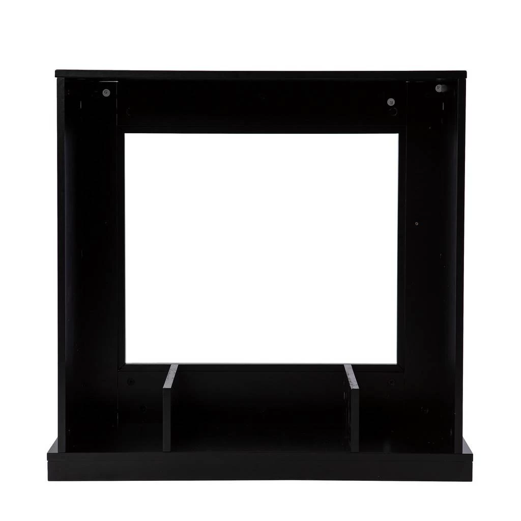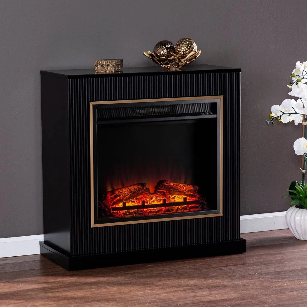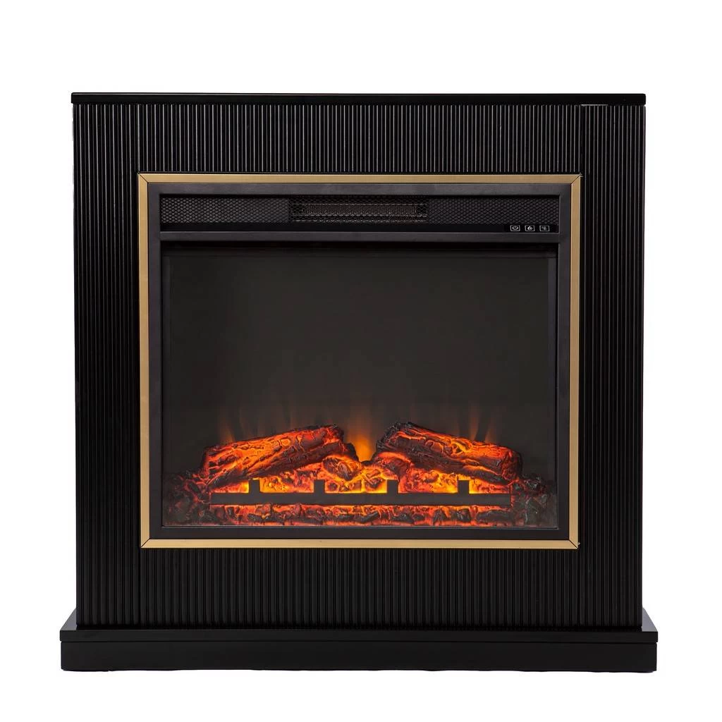 Bring a cozy feel to your modern space with this electric fireplace. A sleek black mantel keeps your living area or dining room chic and sophisticated, while the gold trim adds an elegant hint of color. Flickering flames and lifelike embers create a realistic fireplace look, working with or without heat for year-round ambiance and enjoyment. Put the finishing touch on your contemporary living space with this freestanding electric fireplace.