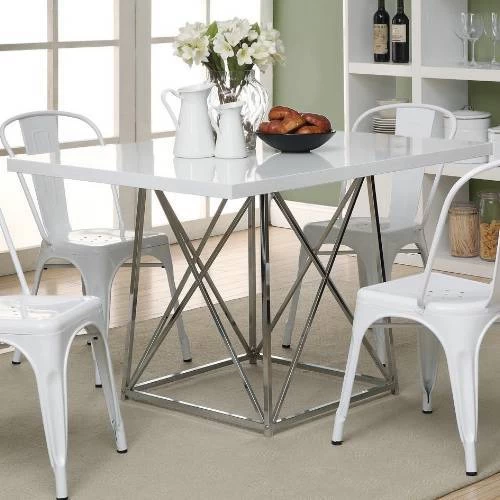 Create a trendy contemporary look with this glossy white 36″ x 48″ diameter dining table. This piece features a sleek chrome metal base and a smooth surface ideal for dining / drinks and tapas. This table is great for dining and entertaining guest especially in smaller spaces. Assembly Required.