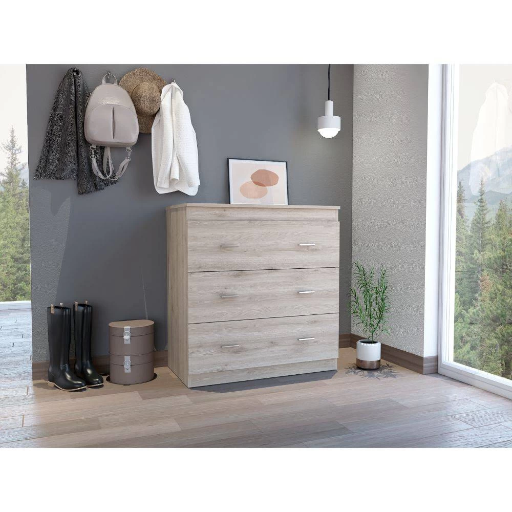 It is a beautiful extra storage space for your clothing, books, or anything you choose, with a modern touch with its metal hardware and spacious three-drawer design 27.95”W X 23.2”H ; moreover, its Superior Top 35,5” is perfect for customizing it in your way with your favorite decorations.