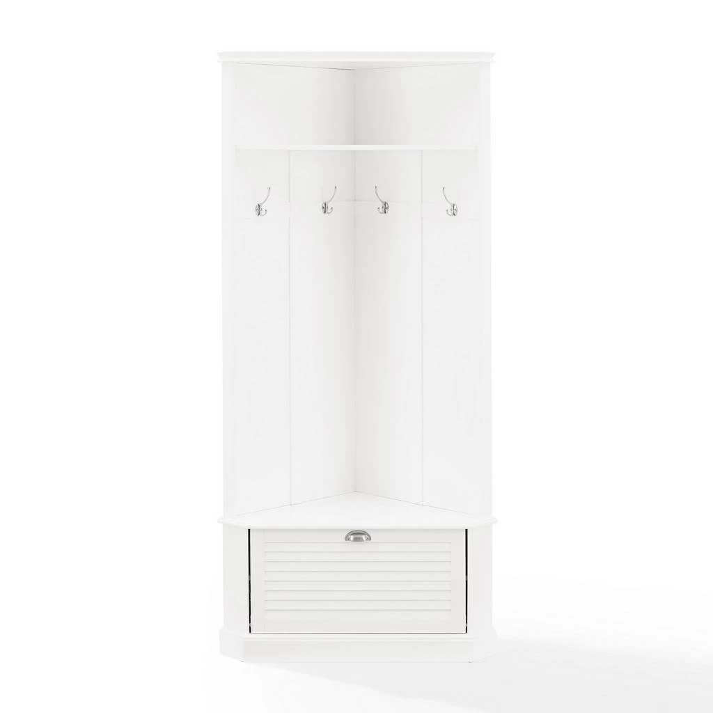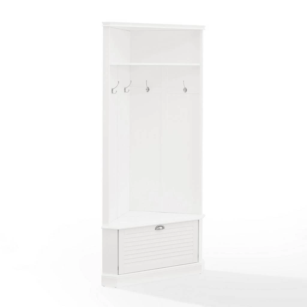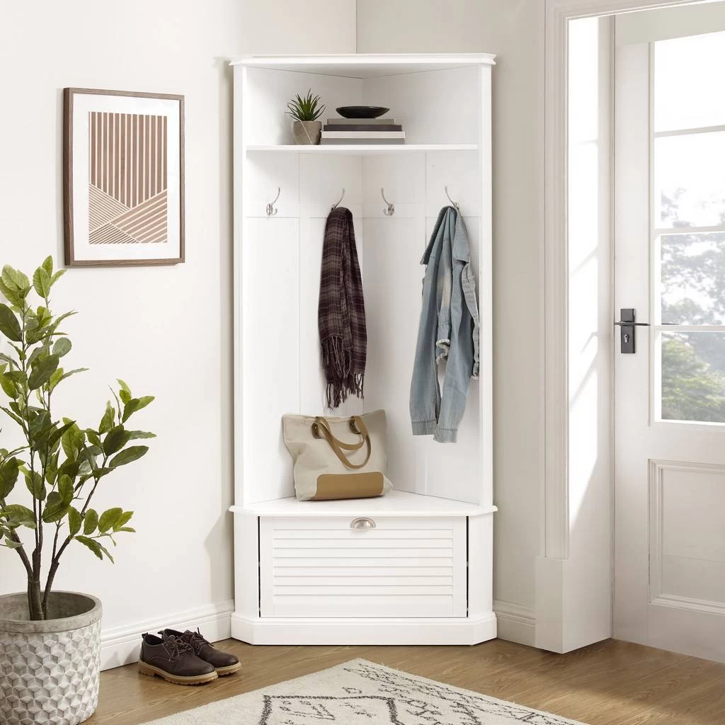 Keep your home’s entryway tidy and organized with the Ellison Corner Hall Tree. Featuring louvered accents on the drop-down cabinet door and raised paneling on the back, this hall tree gives home organization a classic look. This hall tree’s corner-hugging design makes it the perfect coat rack and landing zone for any size entryway. With hooks for hats and a lower cabinet for shoes, the Ellison Corner Hall Tree offers stylish storage wherever it goes.