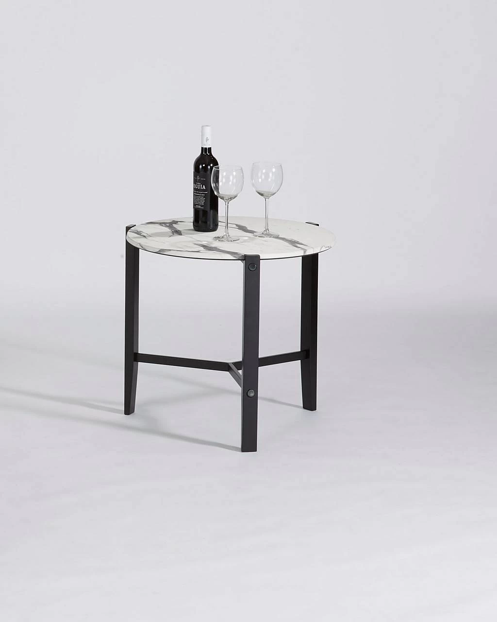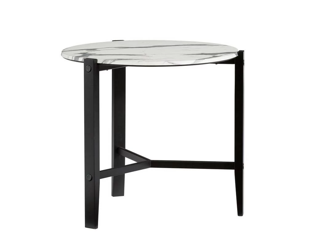 Taking durable to a different level is what this table is all about. Table top is made from moulded High Pressured Laminate hardboard can take on spills, burns, even hammers. Yes I said hammers and if your household is like most, that doesn’t sound so strange. This round “Rowen” table is perfect for sectionals or any modern transitional style that calls for clean sophistication. Table top looks like white calcite marble with a textured feel. Black metal base compliments perfectly. Lightweight for easy mobility.