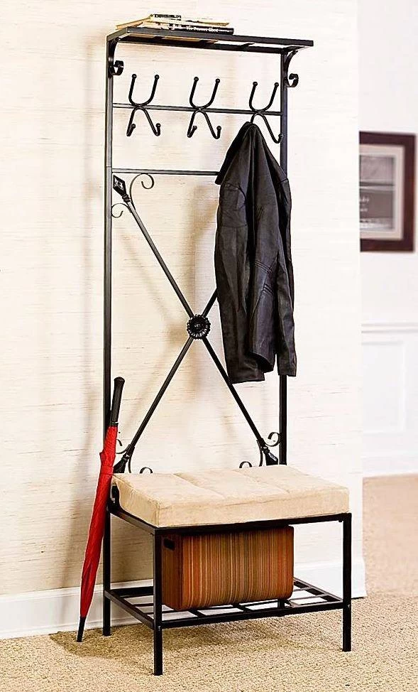 The perfect solution to fill that empty space next to your front or back door is this entryway storage bench. This unit not only gives you a place to hang umbrellas, coats, and bags, but you also get the convenience of being able to sit down to take your shoes on and off. The height of the seat measures 19″ from the ground. The lower shelf is raised 6″ off the ground to give you shoe storage without cluttering the floor. There is also an upper shelf that extrudes 8″ from the wall to top the whole thing off perfect for hats and knick-knacks. The total height of this unit is 72.5 inches with a width of 24 inches and depth of 18 inches. The frame is constructed of metal for strength with a 3 inch foam pillow seat covered in fabric.