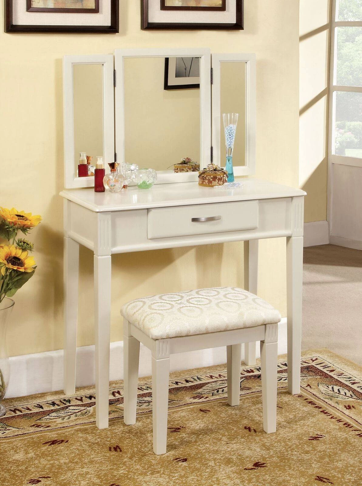 Dimensions: Vanity Table: 32″L X 16″W X 30″H Mirror: 30 3/4″L X 20 1/2″W X 3/4″H Stool: 18 1/4″L X 13″W X 17 3/4″H