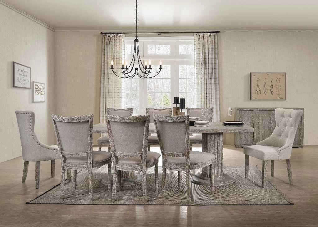 Ideal for a sophisticated dining area, the Gabrian dining collection and its beautifully artistic accents will transform a conventional room into a luxurious dining space. The table features a spectacular double pedestal base with fluted column design type setting. While the chairs are upholstered in a two-tone beige fabric. Every piece of the collection brings a high-fashion look to a cottage-themed living space.