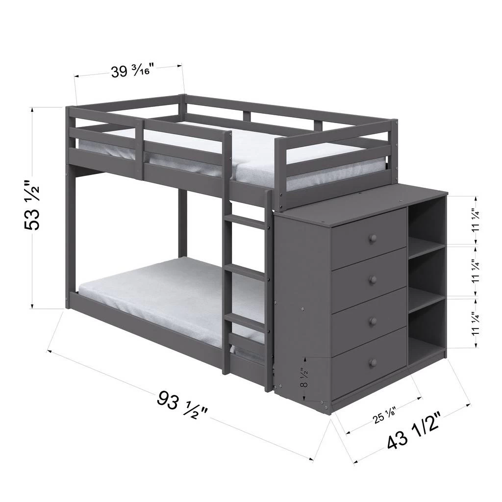 Whether you need extra sleeping space, or your child simply loves sleepovers, this Twin over Twin Bunk Bed is perfect for your home. This Gaston bunk bed with cabinet is designed with a clean silhouette and a modern gray finish. Use the bottom for additional sleeping space or as a play space. The side storage is reversible and will help keep everything nice and tidy.