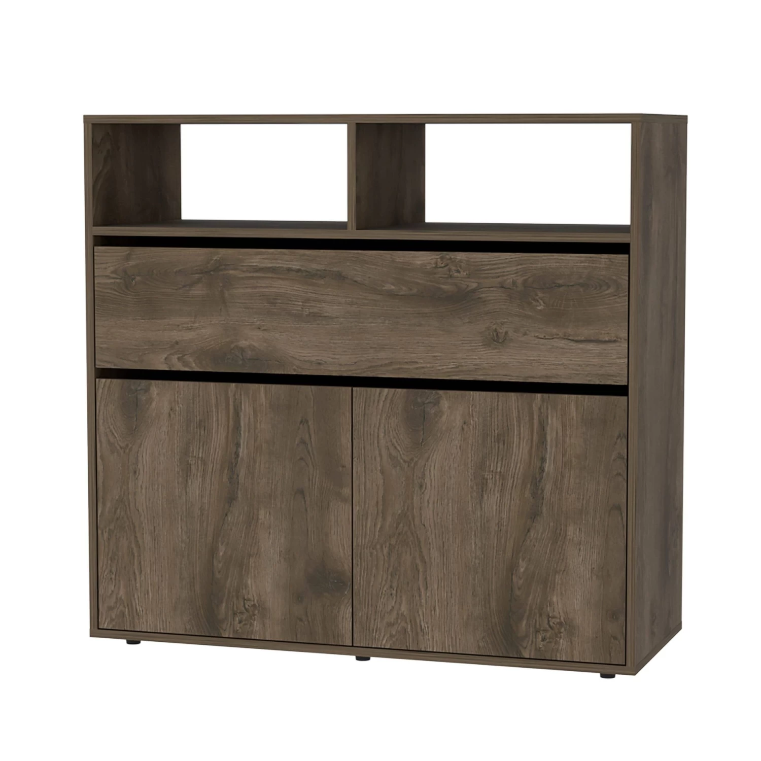 This dresser is made of elegant dark brown manufactured wood.