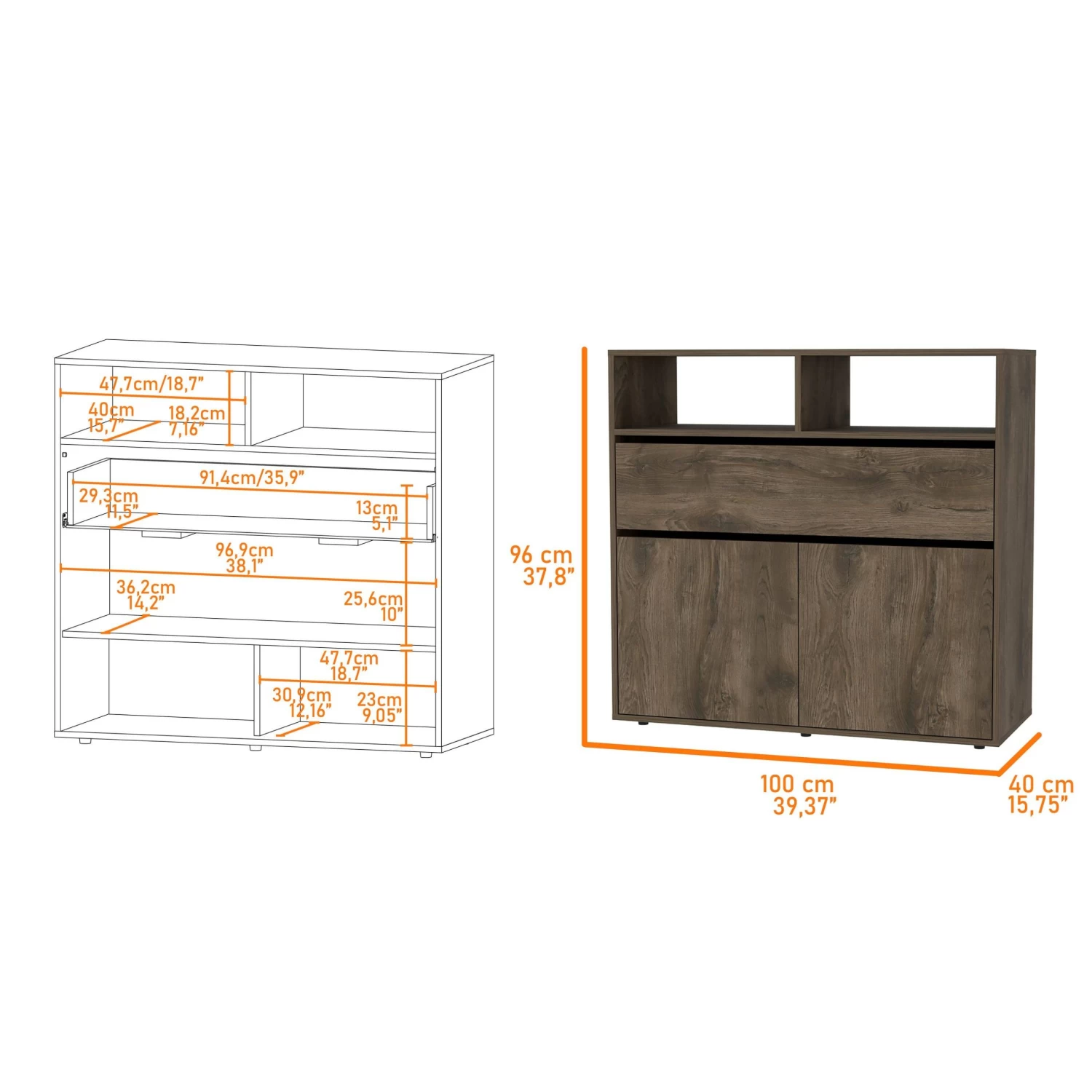 Bedrooms are a place of solace, a retreat from the hustle and bustle of everyday life. But even the most tranquil of sanctuaries can be cluttered and chaotic, with clothes strewn about and jewelry tangled in knots. That’s where the Gianna Dresser comes in. This piece of furniture is the perfect size for any 39,37”W X 15,75”D X 37,8”H and provides ample storage for all your clothes, shoes, and accessories. It has one big drawer 5,1”H X 11,5”D X 35,9”W and a double door cabinet with interior shelves for more storage capacity. With its sleek lines and modern design, the Gianna Dresser will give any bedroom an instant style upgrade.