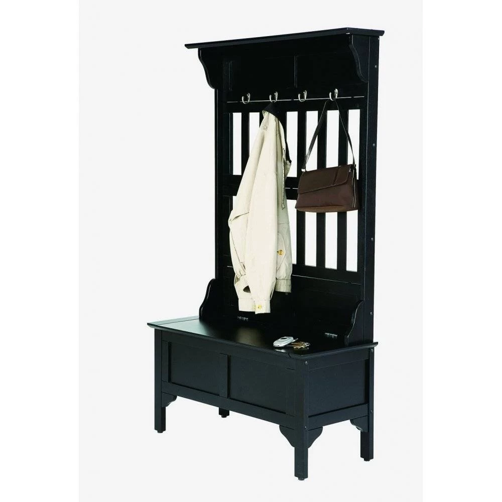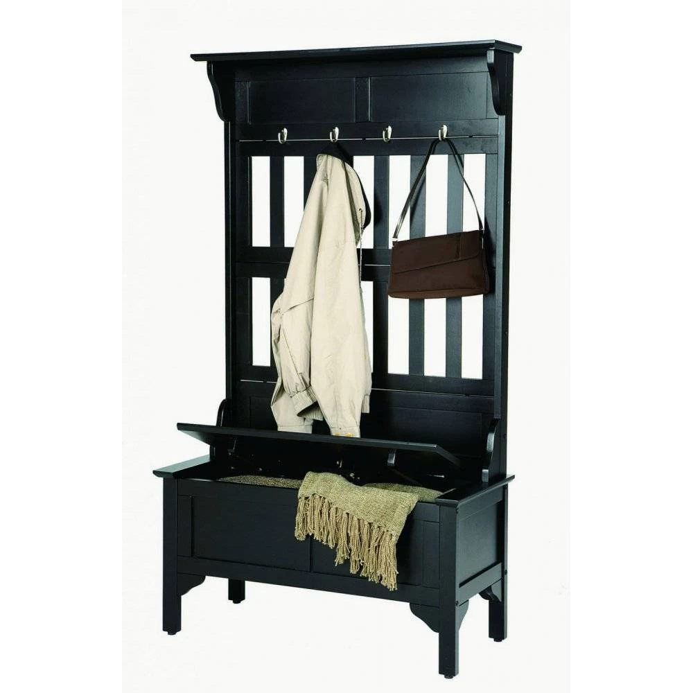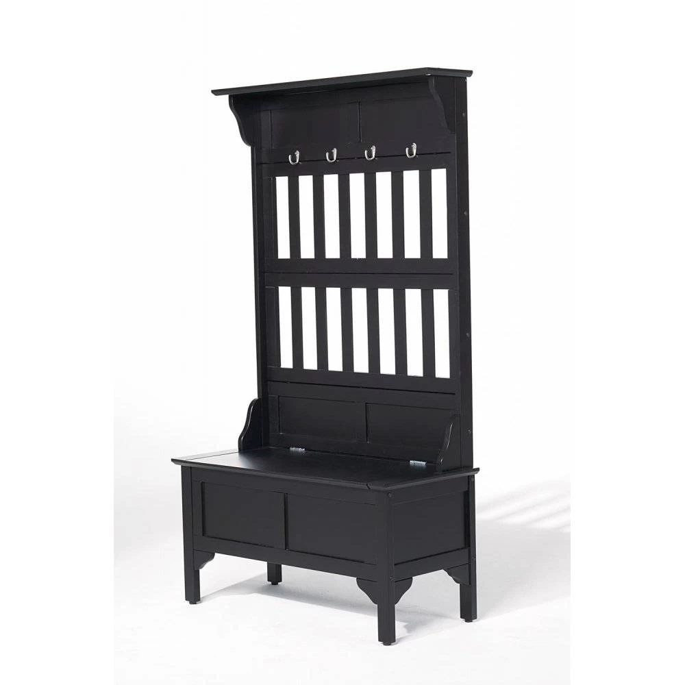 Home Styles Hall Tree and Storage Bench features solid wood construction in a black finish. Full lift top storage bench with safety hinge and four large silver hooks. Size: 35.75w 16d 63h